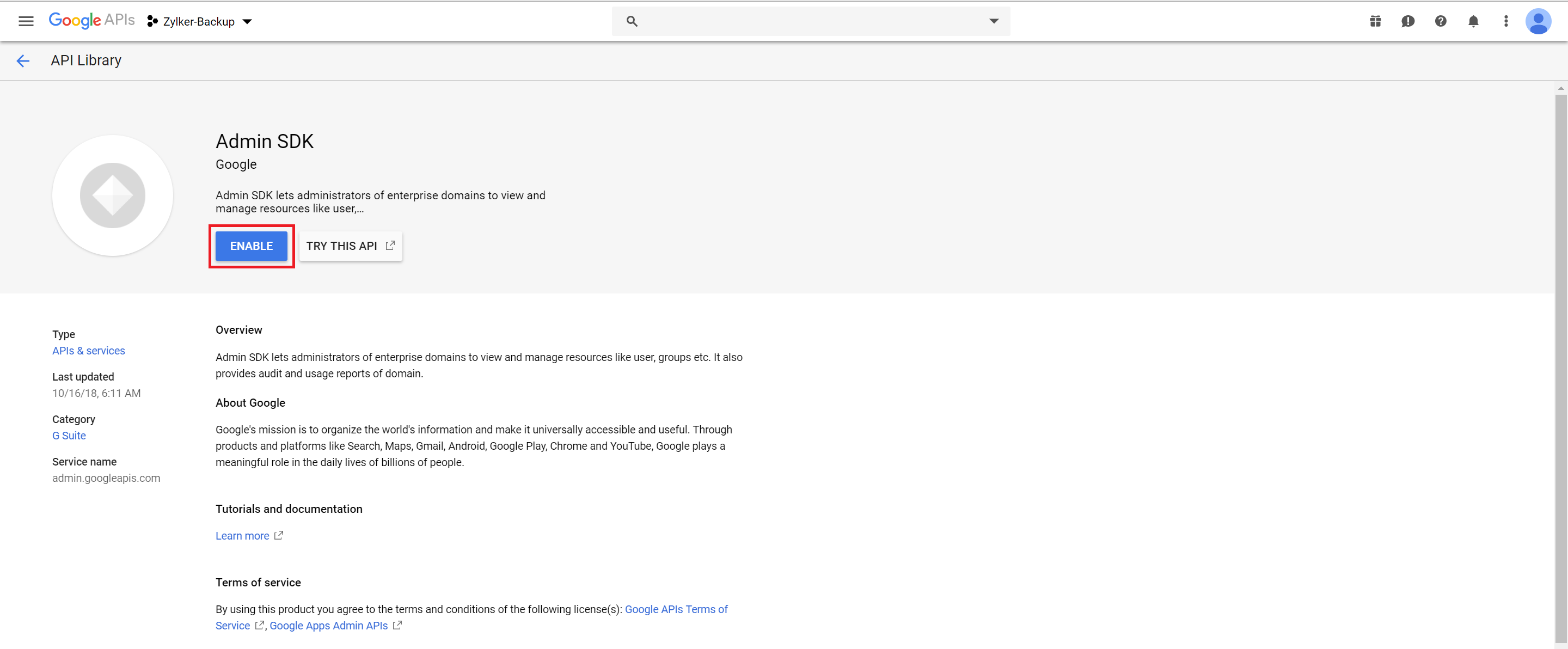 同样地,在搜索框输入Admin SDK并启用搜索结果中的Admin SDK。