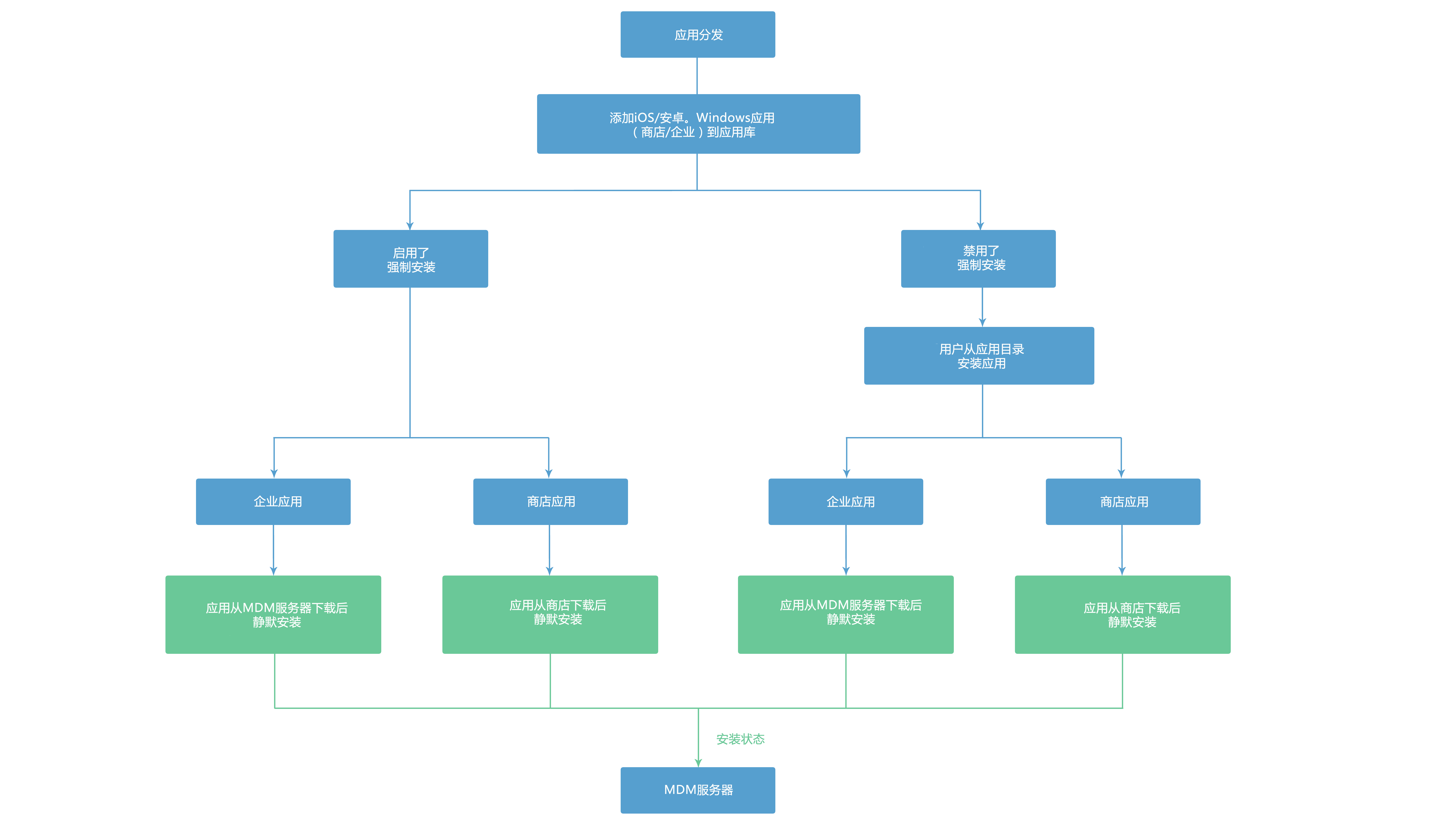 使用MDM应用管理功能的第一步是创建应用库。应用库包含了商店应用和企业应用,创建完成后,即可将库中应用分发给设备。应用分发后,如果是商店应用,将通过商店进行安装,如果是企业应用,则设备将联系MDM进行安装。启动安装后,MDM将几乎实时更新安装状态。应用更新 类似于应用安装,应用删除则更为简单。点击这里了解如何从设备删除应用,点击这里了解如何从组中删除应用。删除应用另一种更简单的方法是 将应用移动到回收站。下面的流程图将帮助您更好地理解MDM的应用安装工作流。