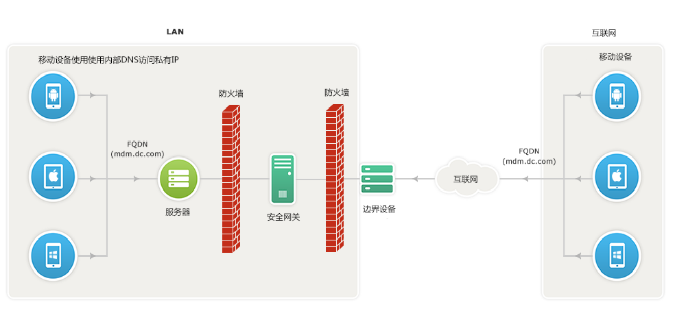 MDM服务器与APNs/FCM/WNS通信,唤醒移动设备。所有移动设备的通信都将经过安全网关,当设备试图联系MDM服务器时,安全网关将接收所有请求,并重定向到MDM服务器。