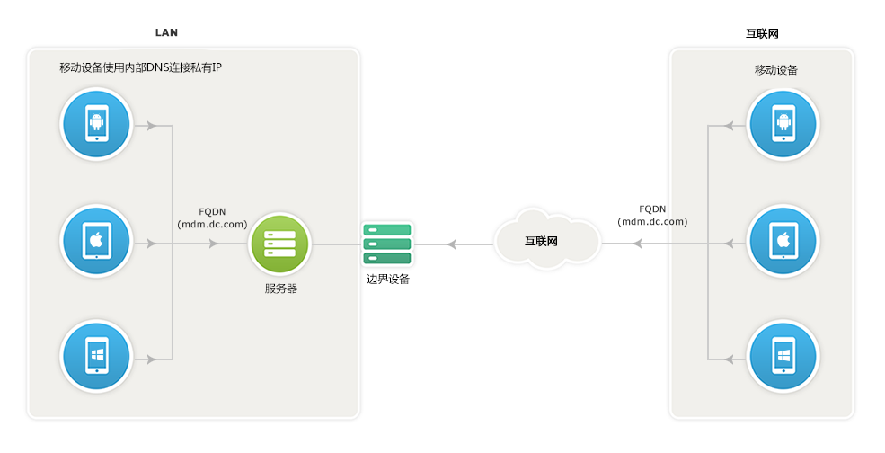 MDM服务器应该可以通过公共IP地址访问,您可以配置NAT设置,使发送到公共IP地址的所有请求都重定向到MDM服务器。