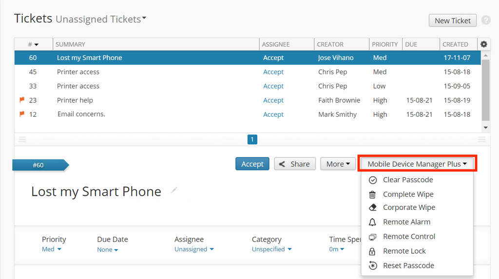 - 现在,您就可以选择工单,点击Mobile Device Manager Plus按钮,根据需要执行命令。