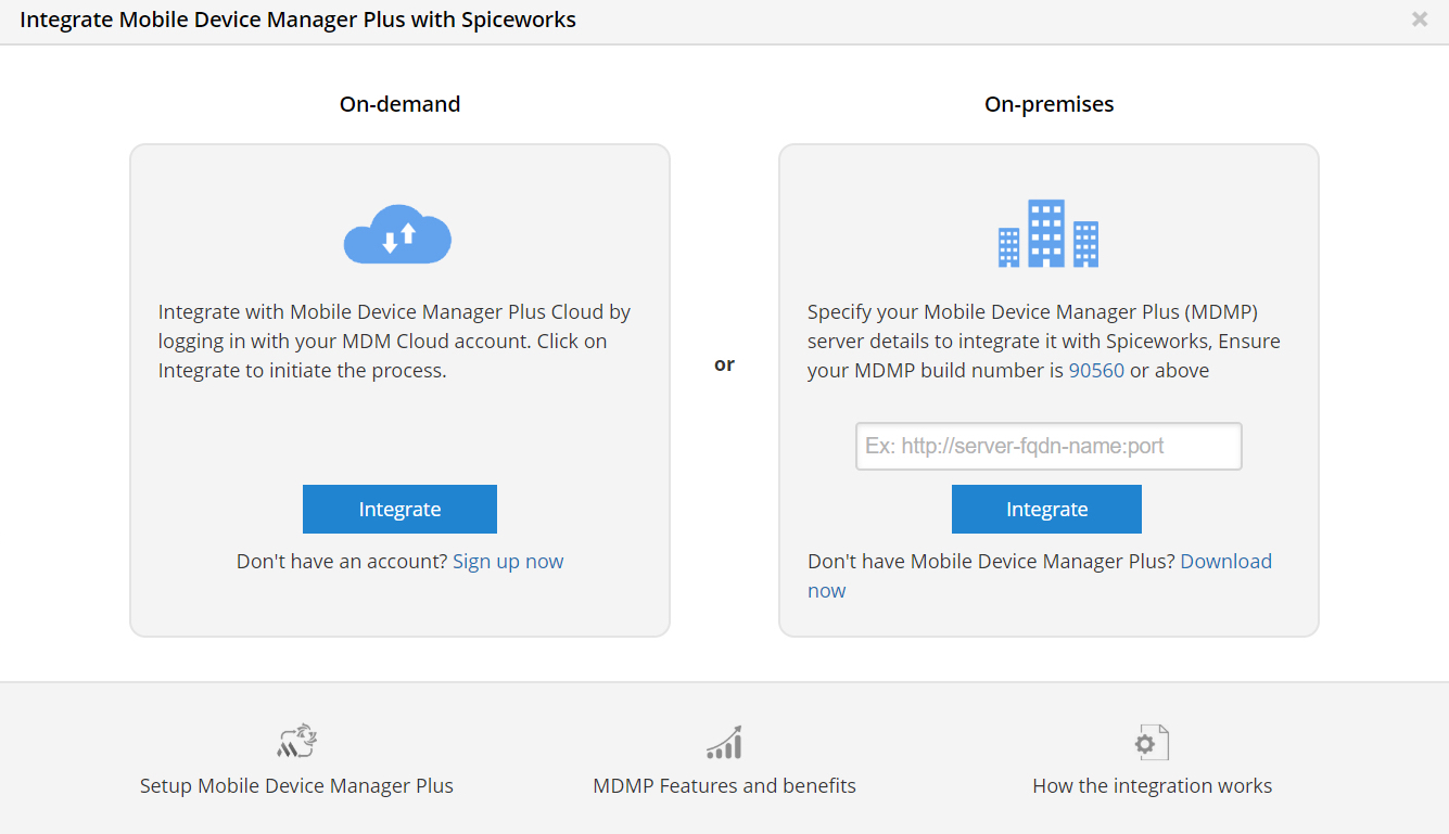 - 插件安装完成后,选择集成Mobile Device Manager Plus本地部署或云版本。