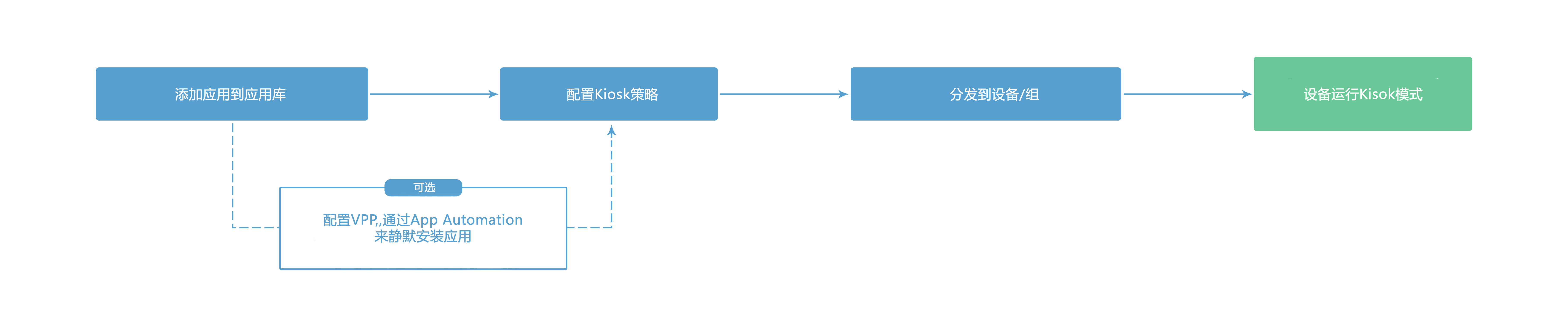 MDM能够自动安装Kiosk中配置的应用(包括商店应用和企业应用)确保Kiosk配置文件的无缝关联。配置文件分发到设备后,Kiosk中配置的企业应用将静默安装到设备上。要自动安装Kiosk中配置的商店应用,需要配置ABM,确保应用安装不需要Apple ID,并且只有通过ABM购买的应用才能静默安装在设备上。点击这里了解更多使用ABM静默安装应用的信息。