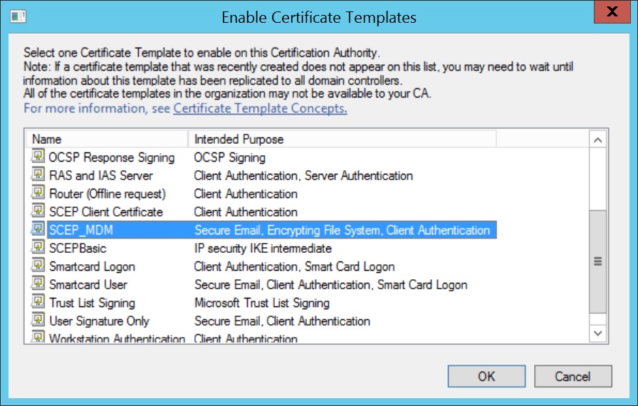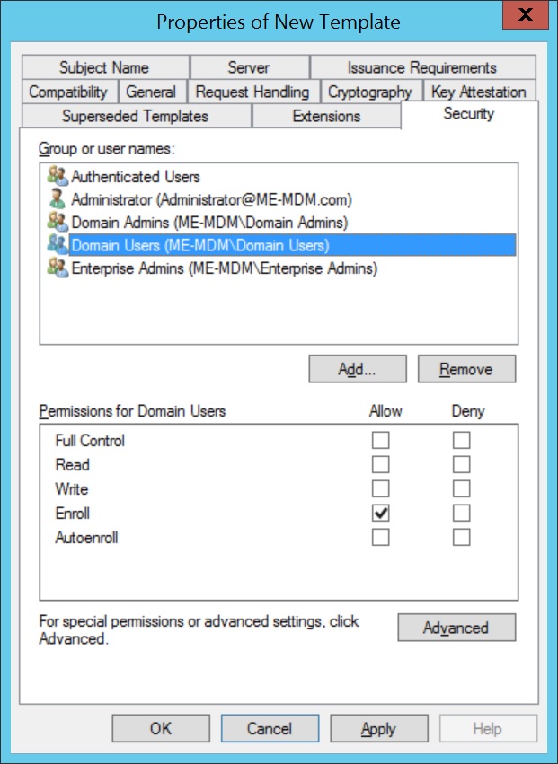 1. 主体的值应采用LDAP DN格式,请参阅 这里。 2. 您可以验证服务器详细信息,如注册挑战密码,请点击 http://<your-server>/CertSrv/mscep_admin 和 http://<Your-Server>/crtsrv/mscep/mscep.dll |