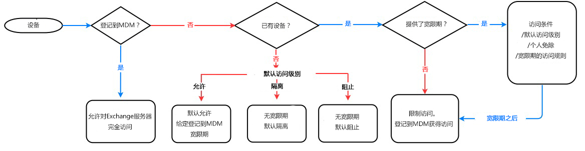 注意:在宽限期内,使用个人免检或设备访问规则允许访问Exchange服务器的设备可以完全访问Exchange服务器,即使没有使用MDM。使用个人免检或设备访问规则拒绝访问Exchange服务器的设备在注册MDM时可以获得对Exchange服务器的完全访问权。在宽限期后,只有注册了MDM的设备才能访问Exchange服务器。