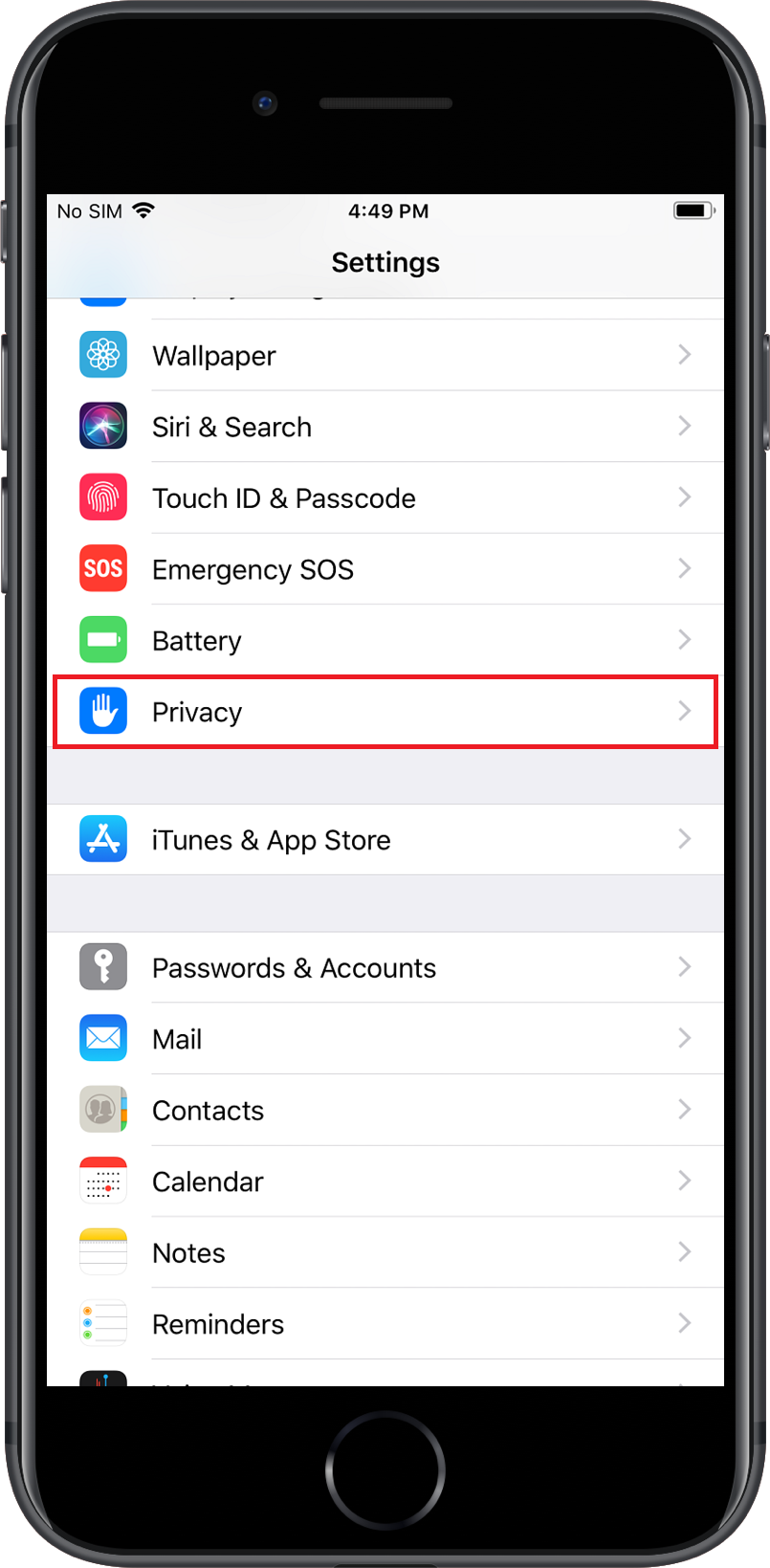 2. 从设置列表中选择隐私。