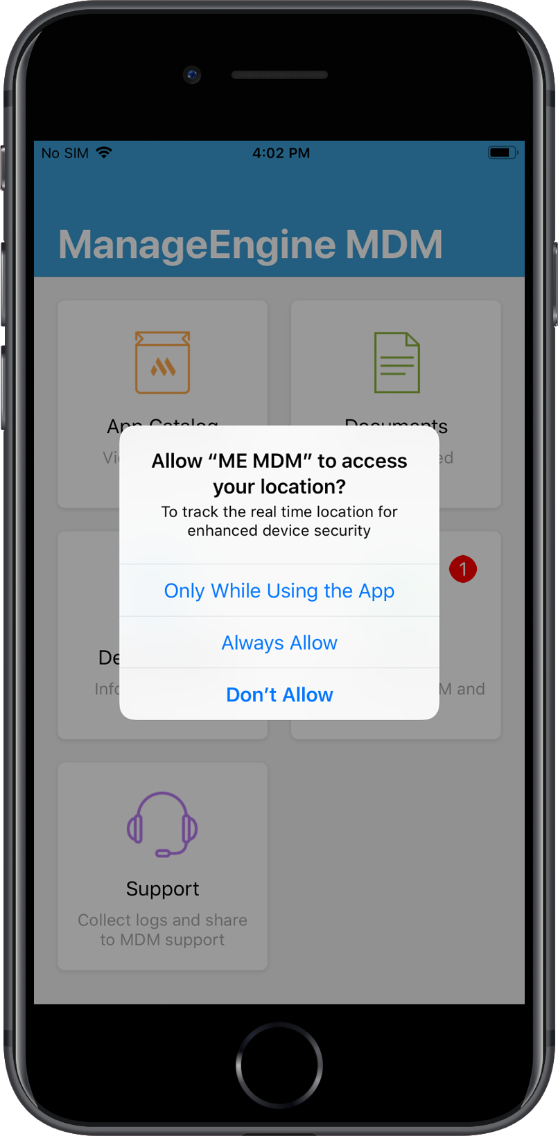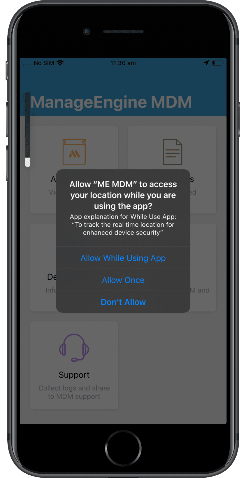 在iOS设备上启用位置服务成功,应用可以开始地理跟踪。在将位置服务设置为始终开启后的几天内,Apple会询问用户ME MDM应用是否需要一直启用定位。此提升只会出现一次,请忽略。