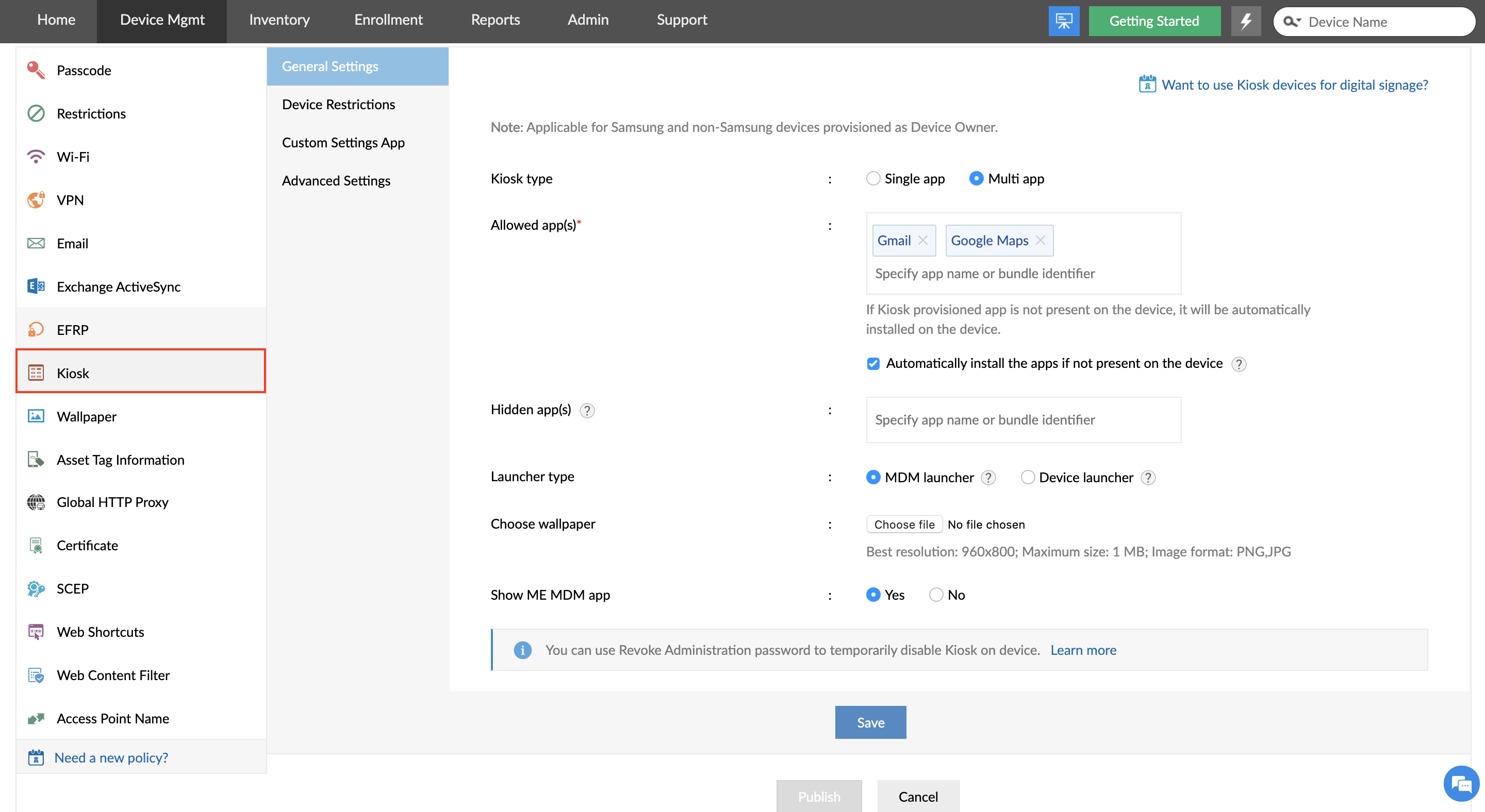 要在安卓平板电脑、移动设备和电视上启用安卓Kiosk模式,请按照以下步骤使用Mobile Device Manager Plus(安卓Kiosk模式应用程序)创建Kiosk配置文件: