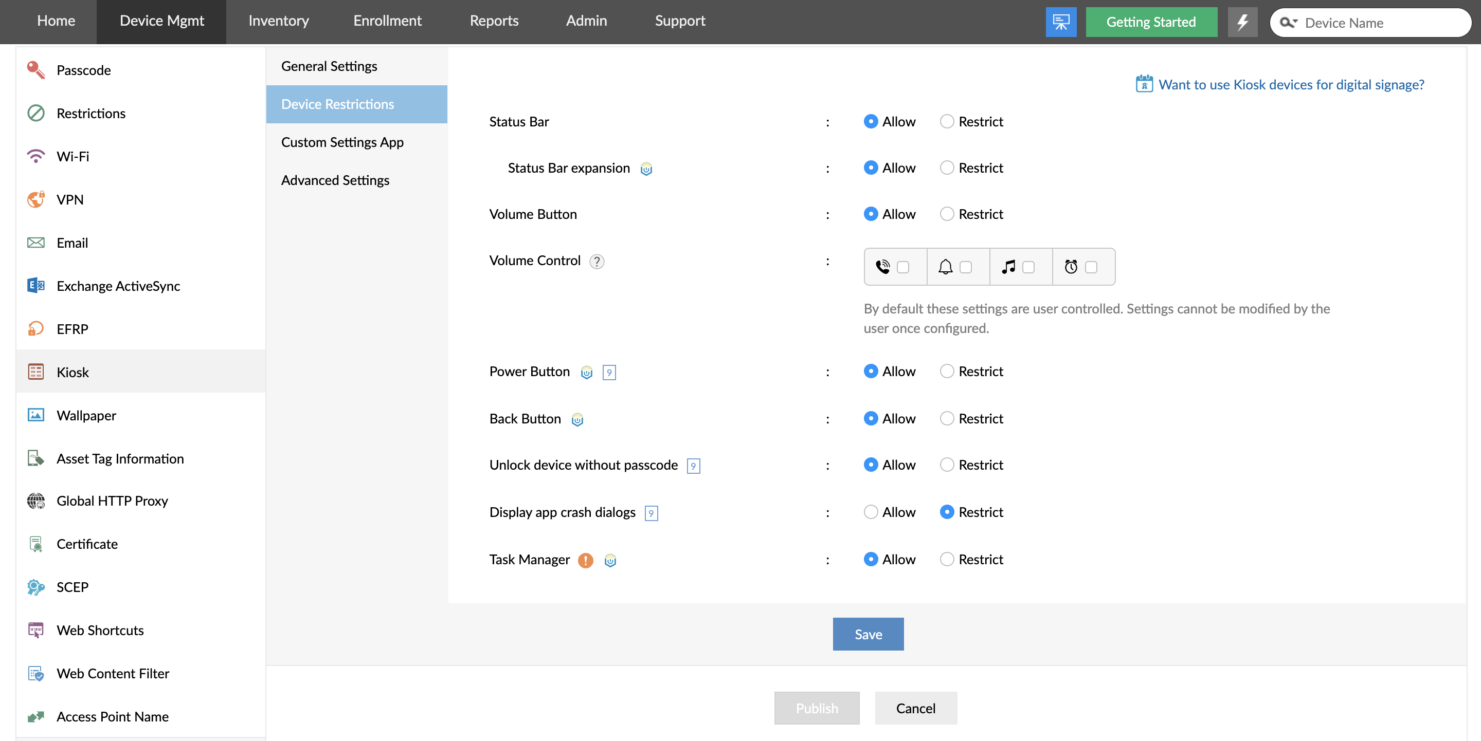 步骤6:点击保存和发布保存安卓Kiosk模式配置文件。