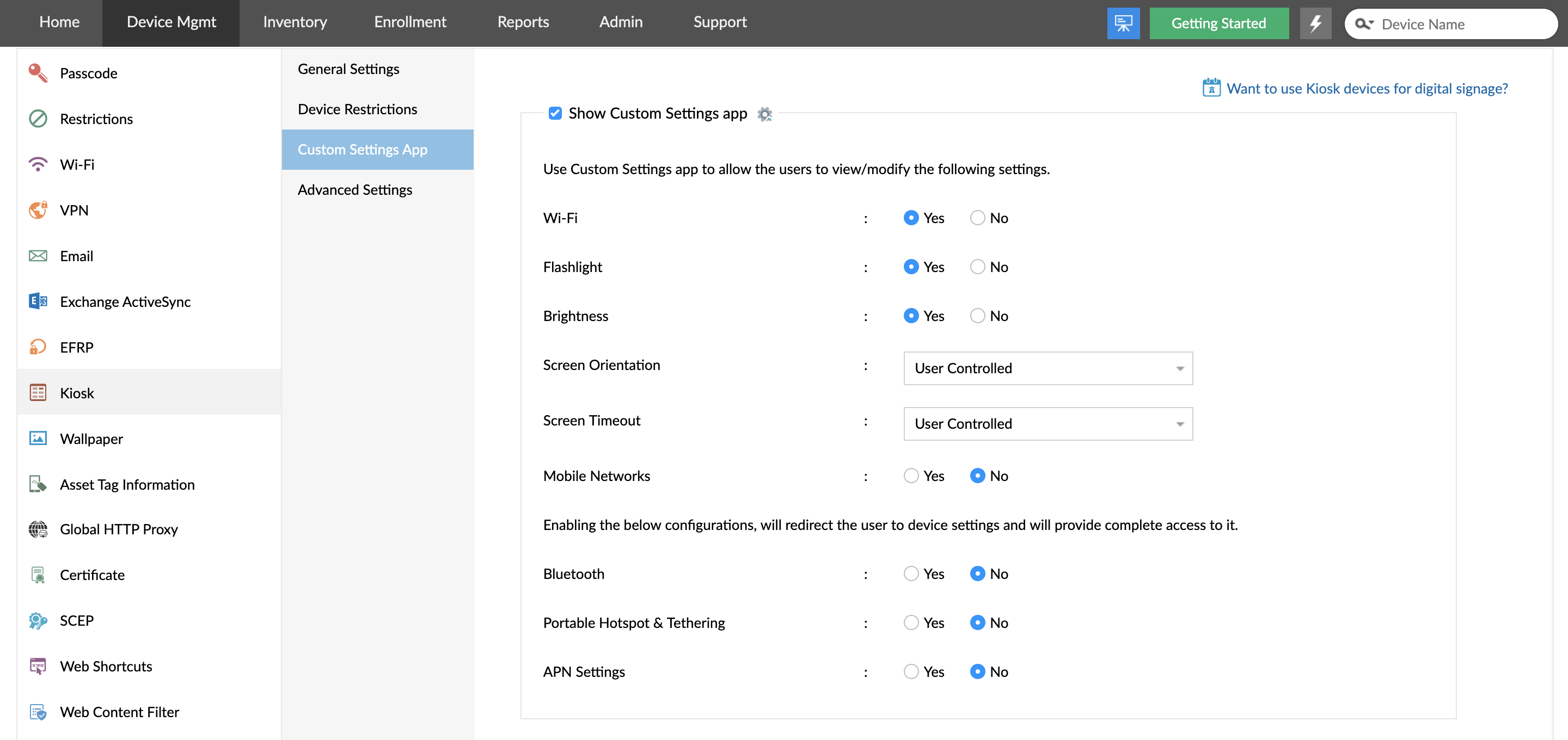 虽然屏幕固定通过将设备锁定到单个应用或屏幕来在安卓设备上启用单应用Kiosk模式,但对于更持久的Kiosk模式,建议使用安卓Kiosk模式软件。ManageEngine的Mobile Device Manager Plus是一个移动设备管理(MDM)解决方案,它兼作安卓Kiosk软件,支持安卓平板电脑Kiosk模式,并将移动设备配置为安卓Kiosk。