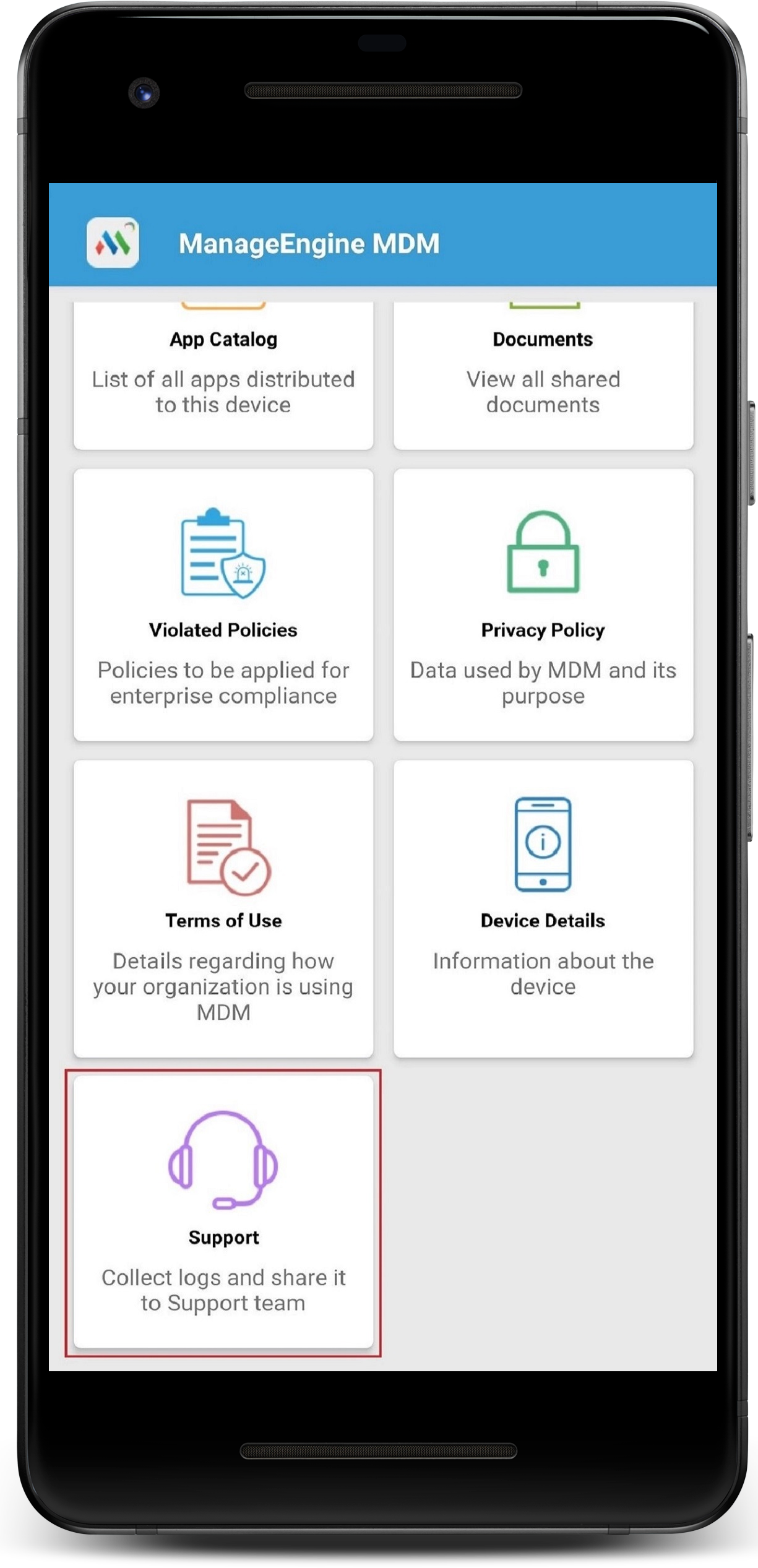 您还可以上传MDM管理的安卓设备的日志。您可以找到归档日志的步骤以及将日志发送到Mobile Device Manager Plus支持团队的步骤。