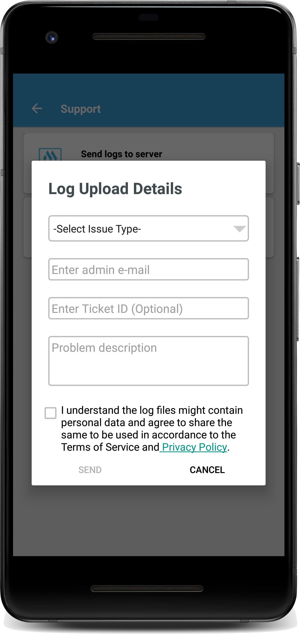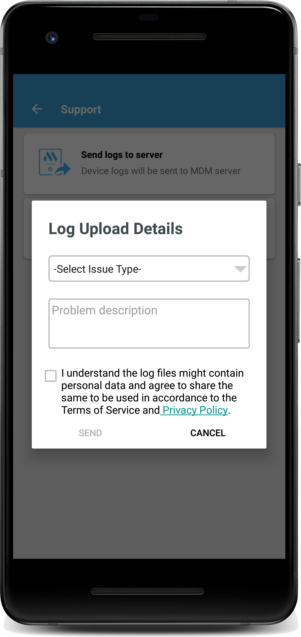 要将设备日志直接发送到MDM服务器,请选择发送日志到服务器选项,然后按照屏幕上的说明进行操作。选中复选框,然后点击发送。