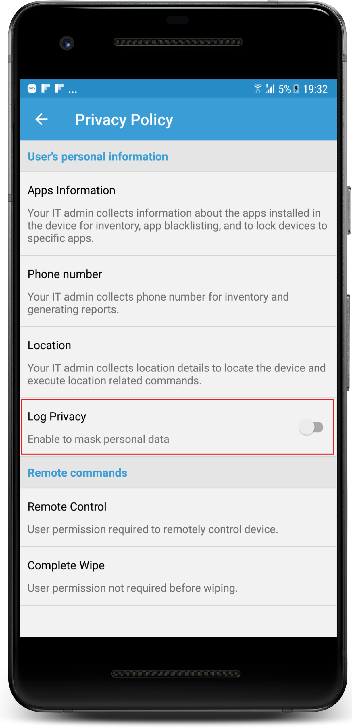 然后将设备日志直接发送到MDM支持团队。共享日志后,通过导航至隐私策略页签启用日志隐私。