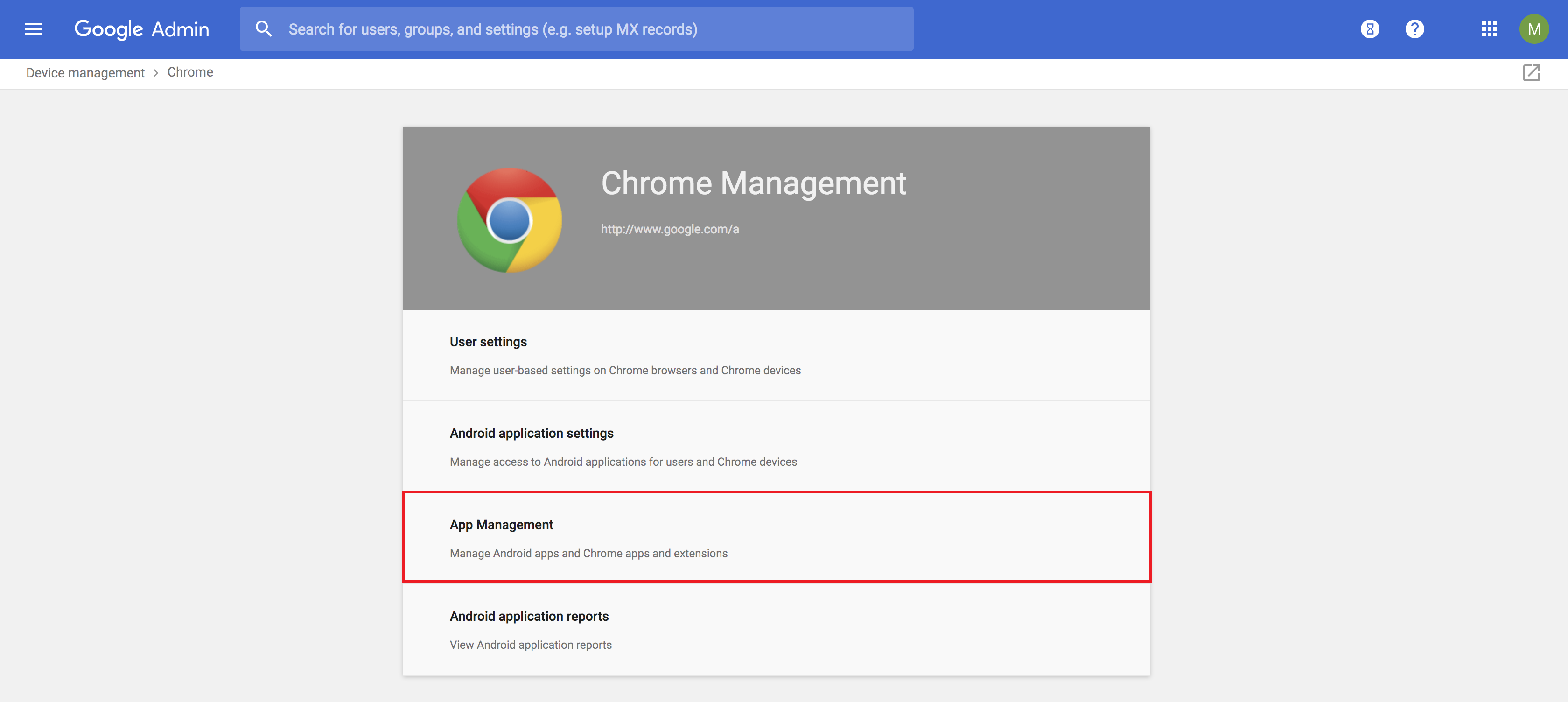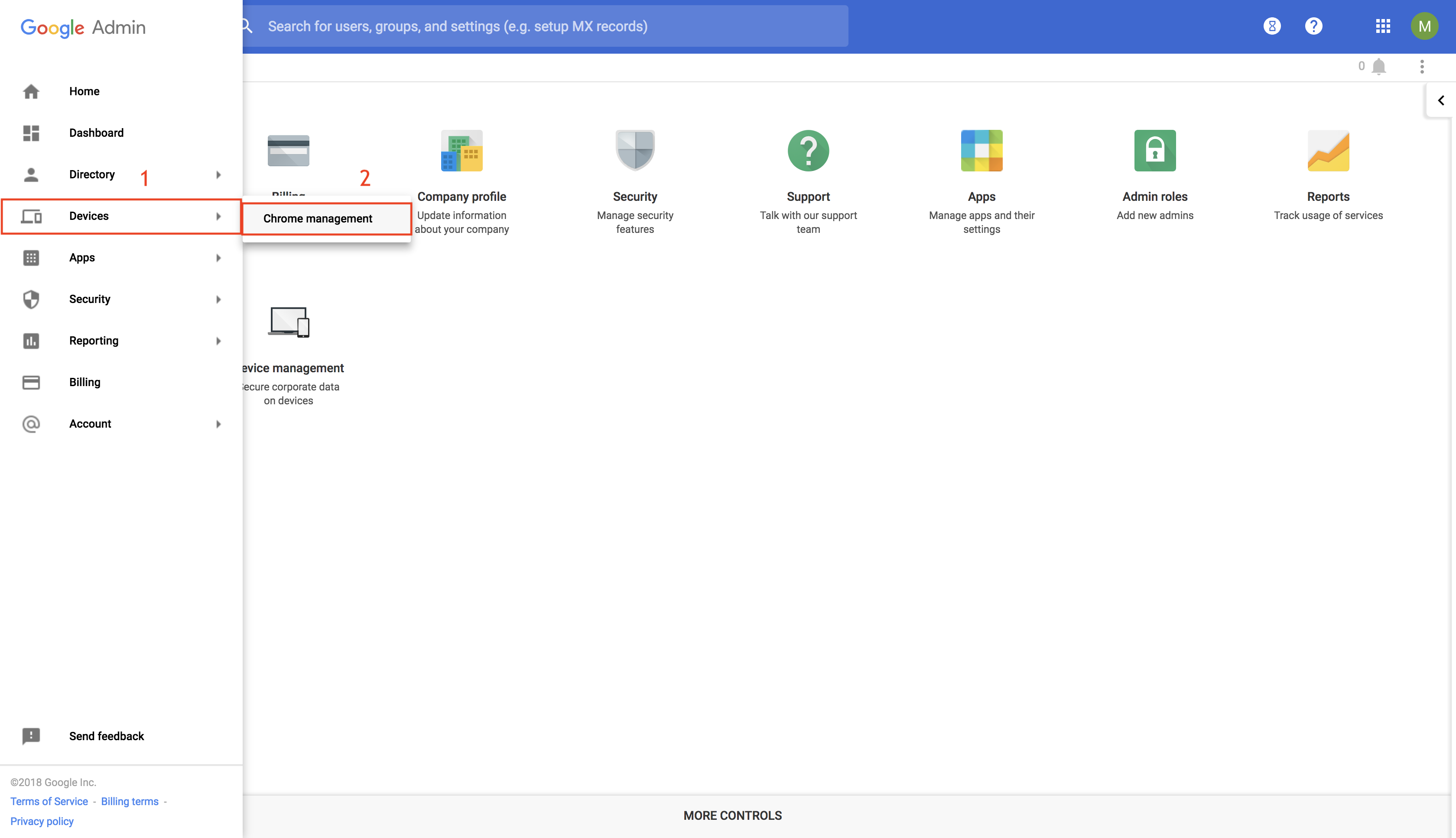 - 点击左边的Google管理菜单。点击设备,然后选择Chrome管理。
