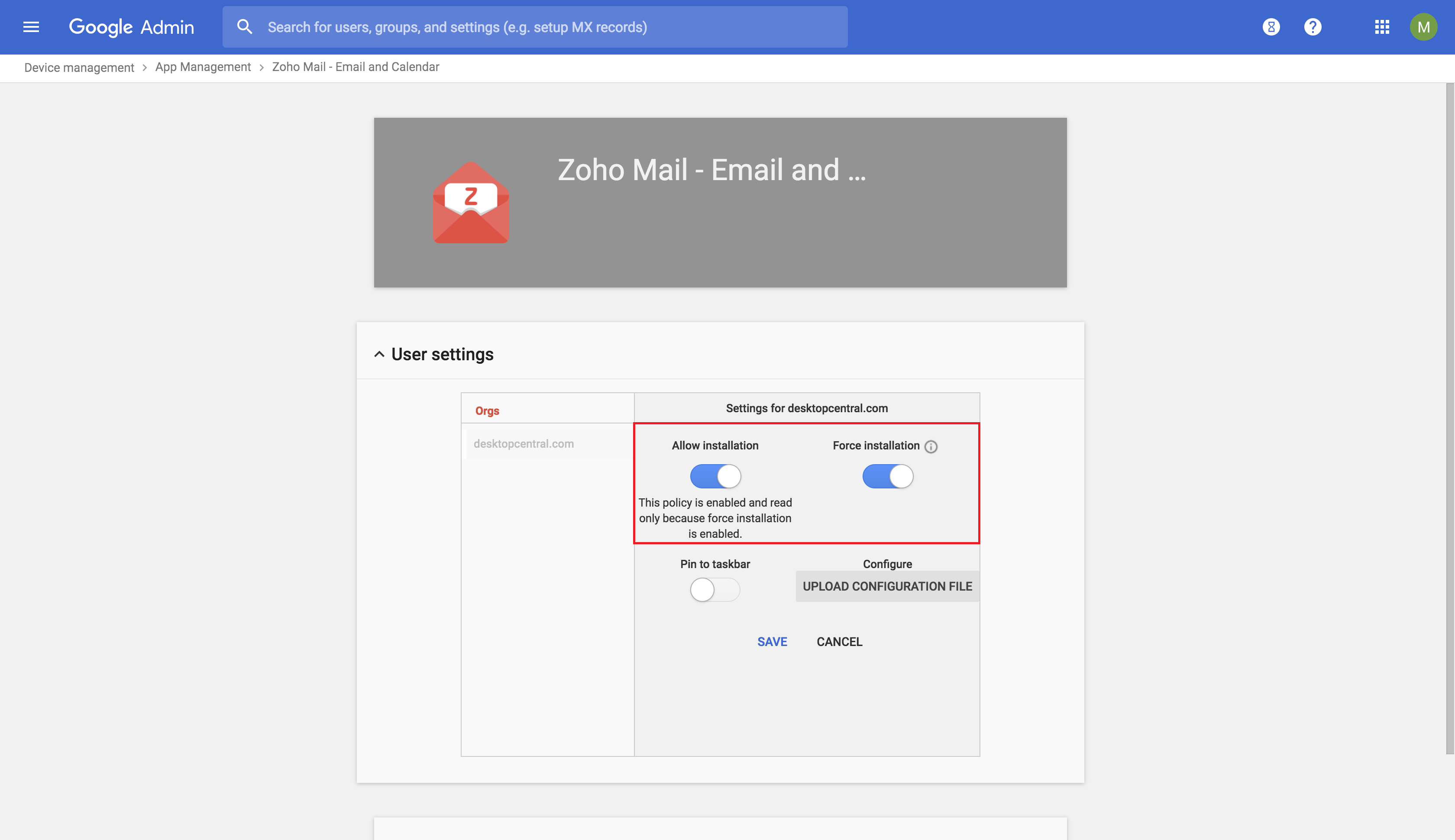 - 切换以启用允许安装和强制安装。您还可以选择启用选项锁定到任务栏或上传配置文件,以便在需要时预配置应用。如果在Google管理门户中批准的应用存在于应用库中,那么您可以跳过接下来的两个步骤。