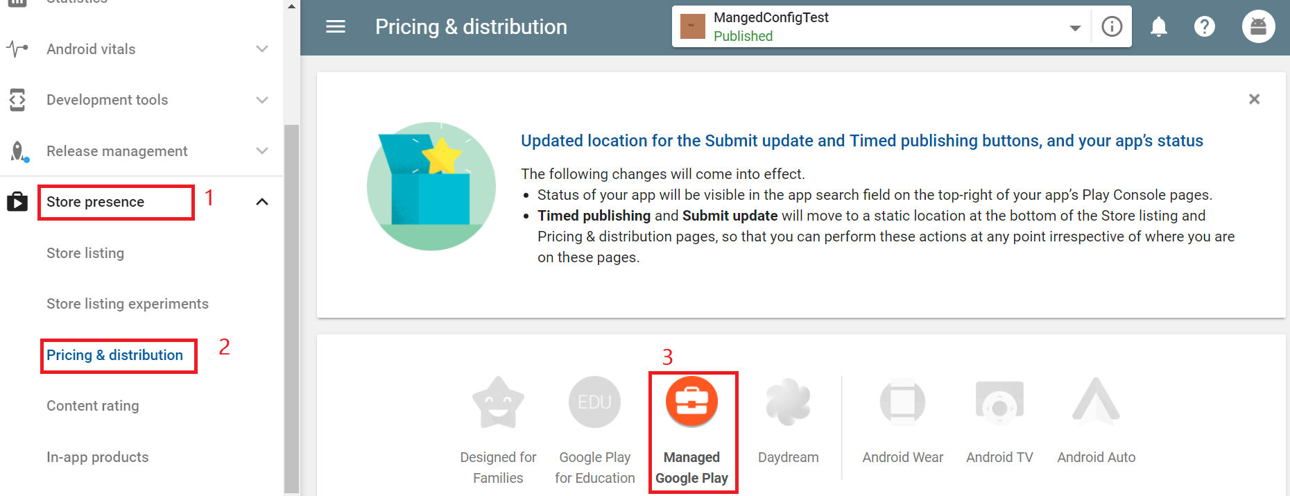 发布企业应用后,点击它并进入Store presence -> 价格与分发,然后点击被管Google Play。