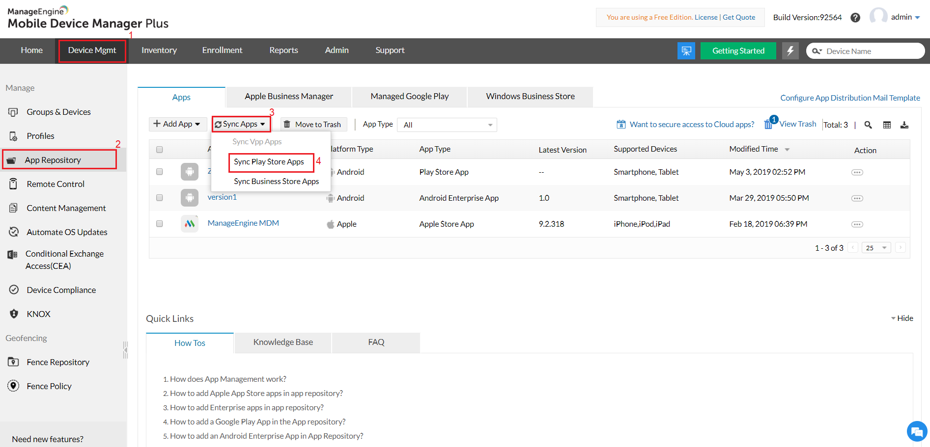 在MDM服务器上,进入设备管理页签,点击左侧窗格中的应用库。现在,点击同步应用并选择同步Play Store应用。成功同步后,作为私人应用发布的企业应用将添加到MDM的应用库中。