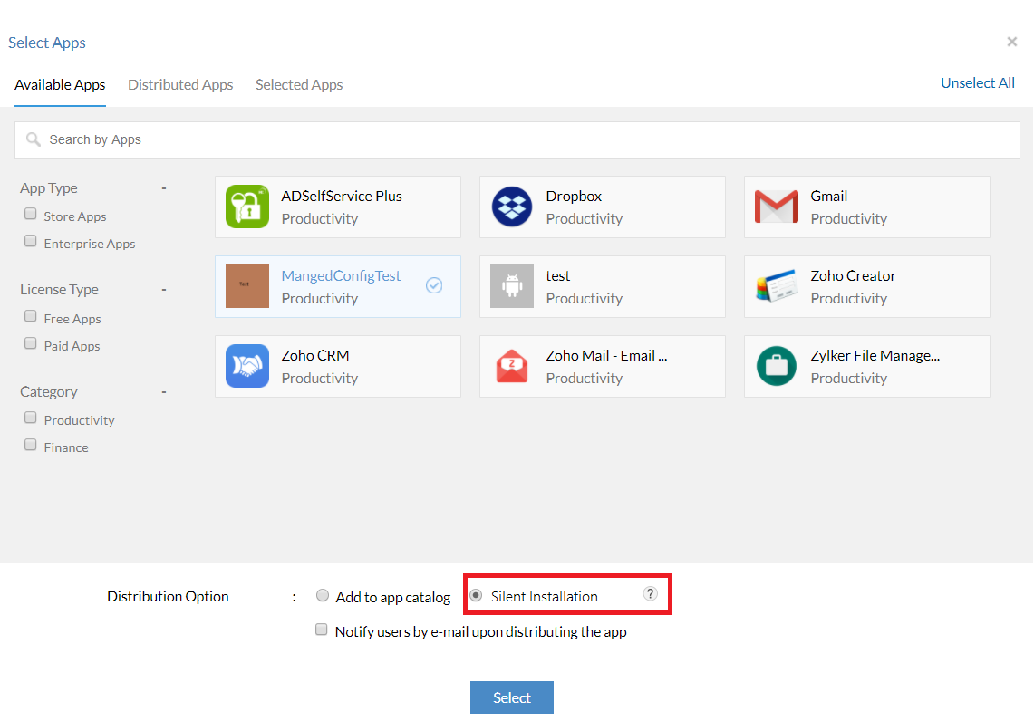 现在,根据需要将应用分发到设备或组。在MDM服务器上,进入设备管理页签,选择应用需要分发到的组/设备。点击分发应用。要确保应用以静默方式安装,选择静默安装,然后点击选择。