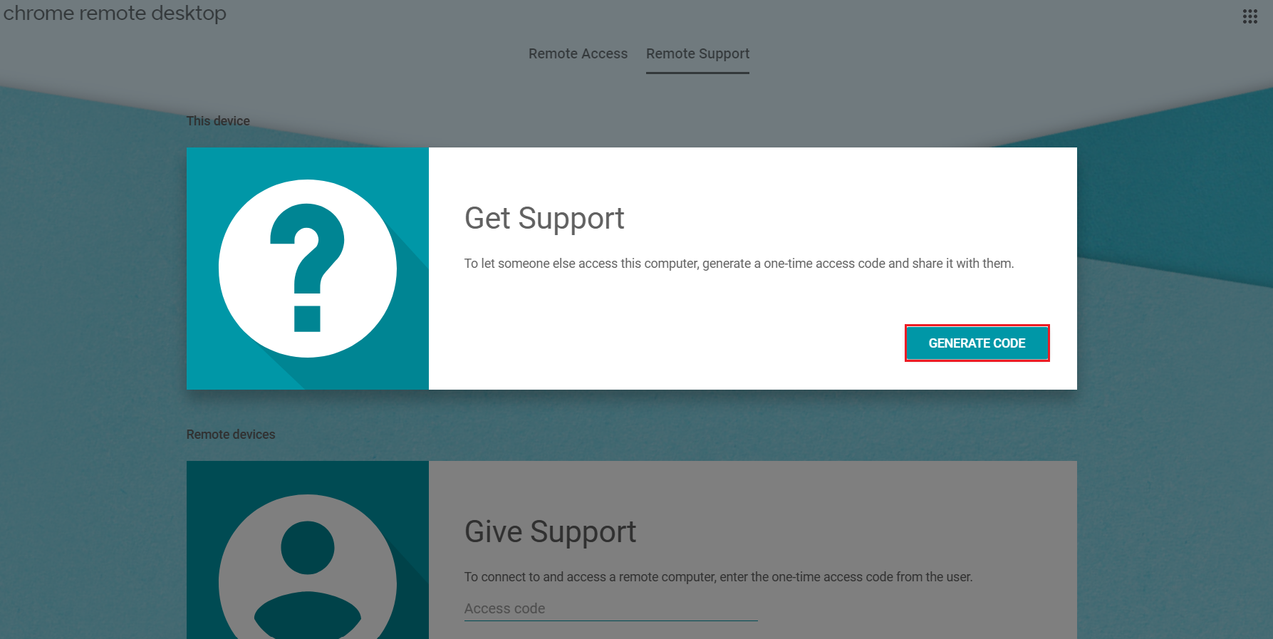 - 在得到支撑,单击摹enerate代码 和复制系统产生的12位数字代码。与管理员共享生成的代码。这一次访问代码将在5分钟后过期。