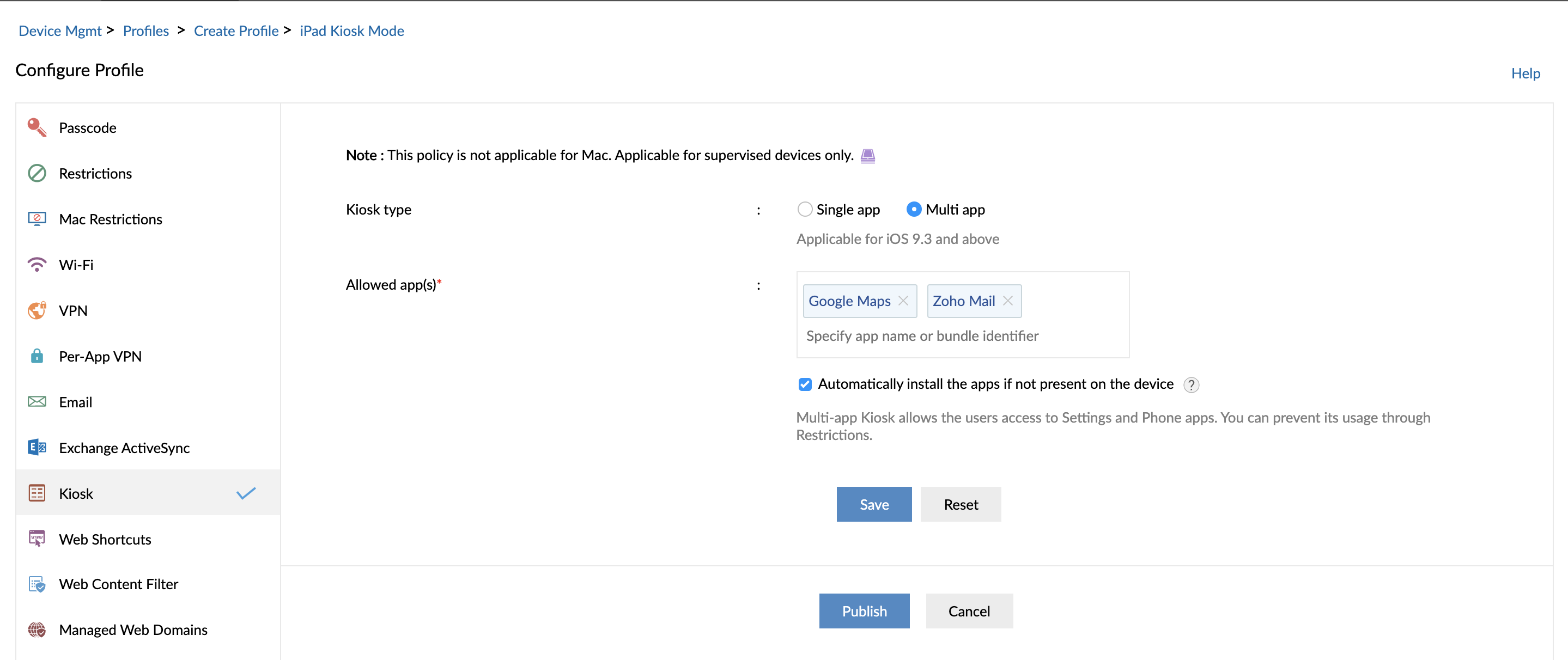 第3步:单击Kiosk从策略列表中。选择Kiosk类型作为单个应用程序或多应用程序,要启用多个应用程序的iPad Kiosk模式,请在下一个字段中指定iPad Kiosk应用程序。配置设备设置,并根据需要限制硬件按钮。假设POS设备将用作自助服务亭,则可以禁用“睡眠/唤醒”按钮,以确保设备在iPad Kiosk模式下配置时始终处于打开状态。
