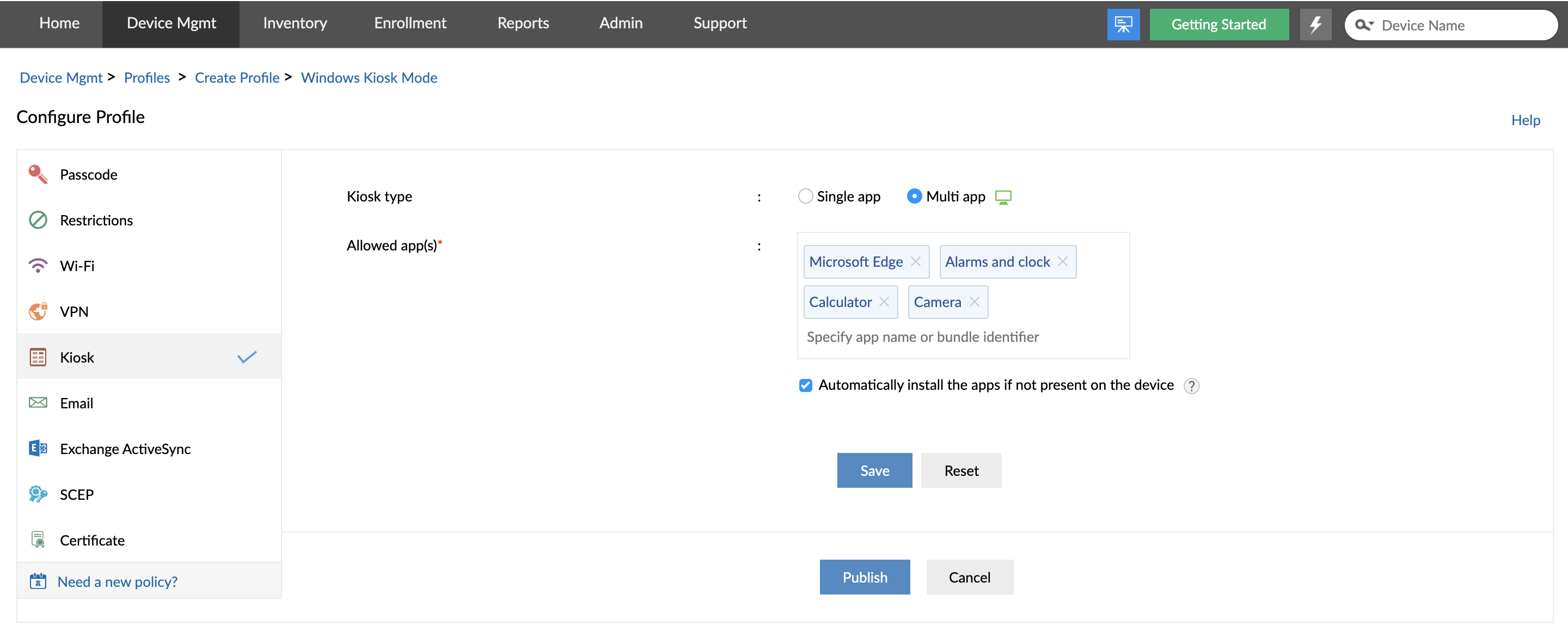 要使用多个应用程序设置Windows 10 Kiosk模式,需要在MDM上创建Windows Kiosk配置文件。按照以下步骤在Windows 10设备上配置Kiosk模式: