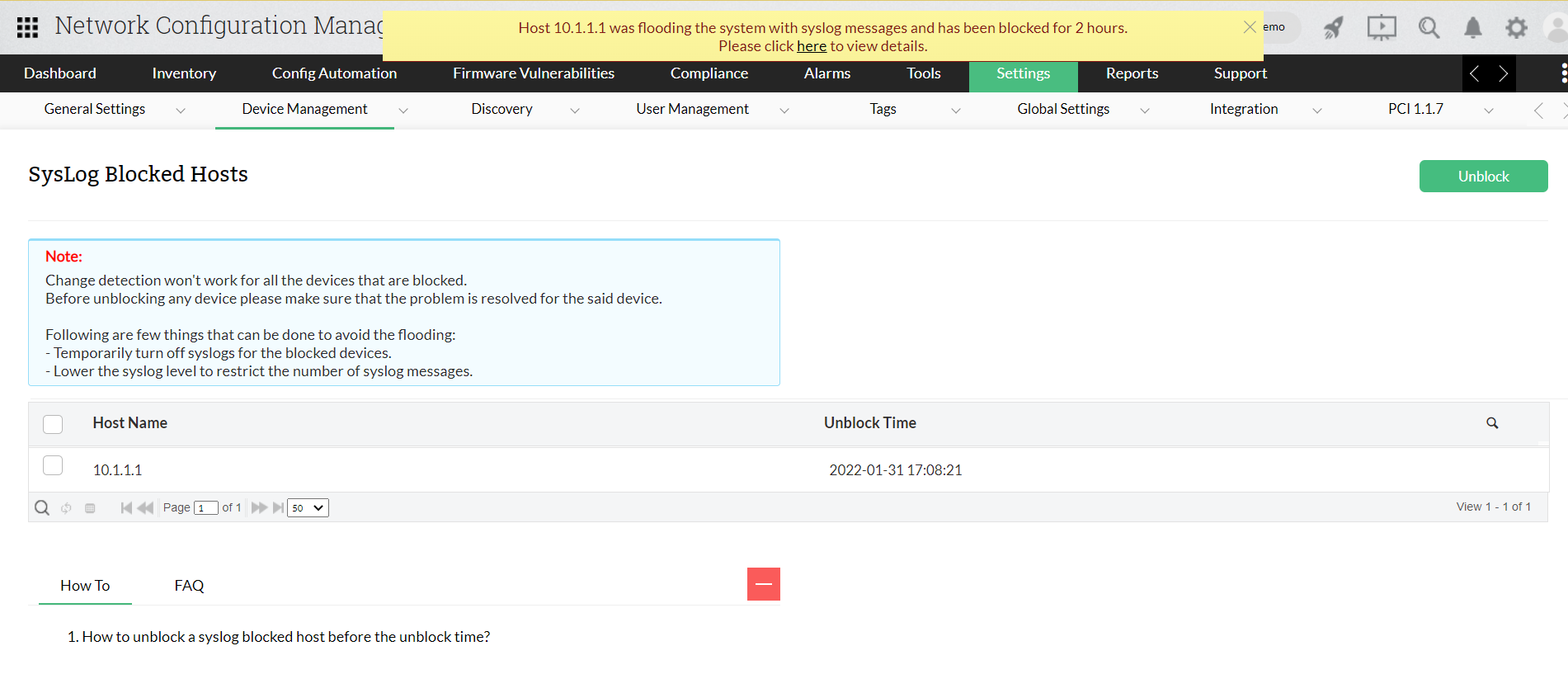 在用户更频繁地登录和注销设备的环境中,系统日志消息往往会泛滥。这导致NCM服务器的CPU使用率增加,进而影响机器的性能。为了防止这种情况,NCM会阻止来自该设备的syslog消息,并通知用户有关已被阻止的设备。