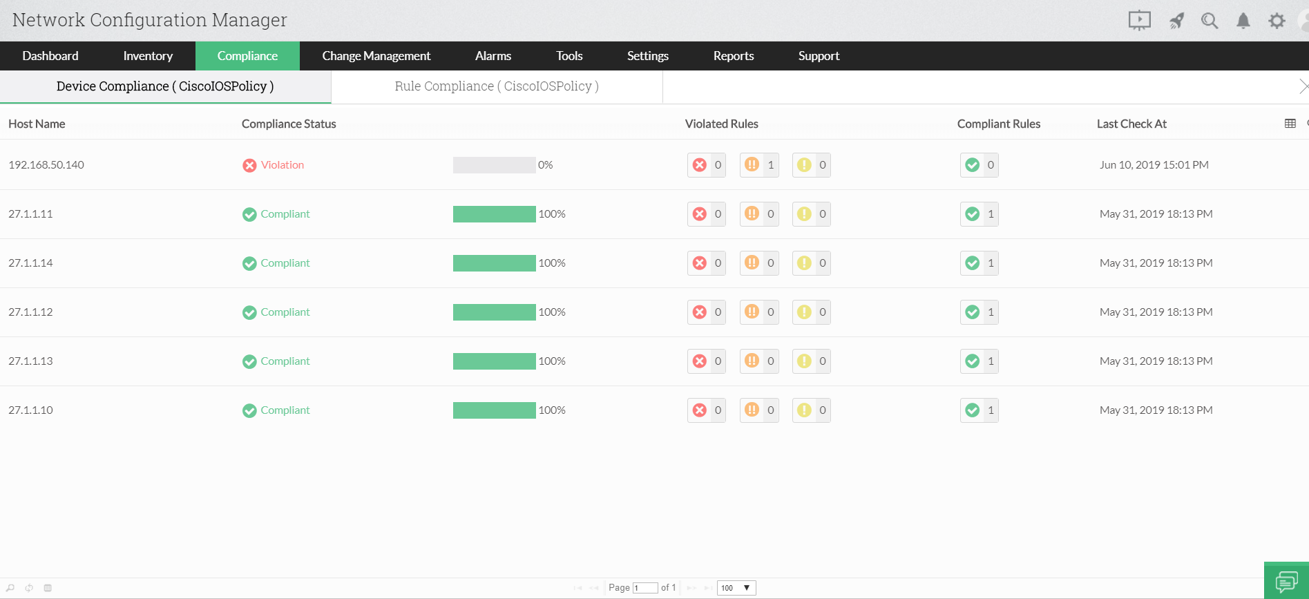 为了确保最大限度的安全性并避免惩罚,组织必须遵守各种标准。使用Network Configuration Manager,您可以执行手动遵从性检查,或者在需要时安排它们并接收详细的报告。