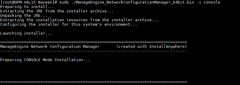 第1步:使用管理员权限(sudo)并在-i控制台选项执行ManageEngine_NetworkConfigurationManager_64bit.bin。