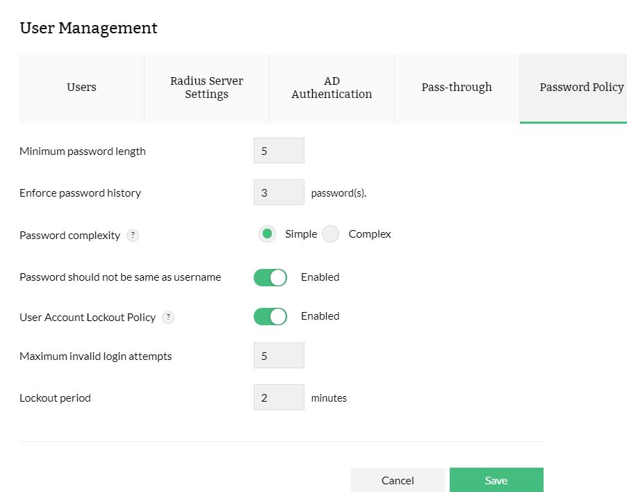 Network Configuration Manager允许您设置密码参数。这可以通过进入设置--> 用户管理--> 密码策略来完成。以下是您可以编辑的条件: