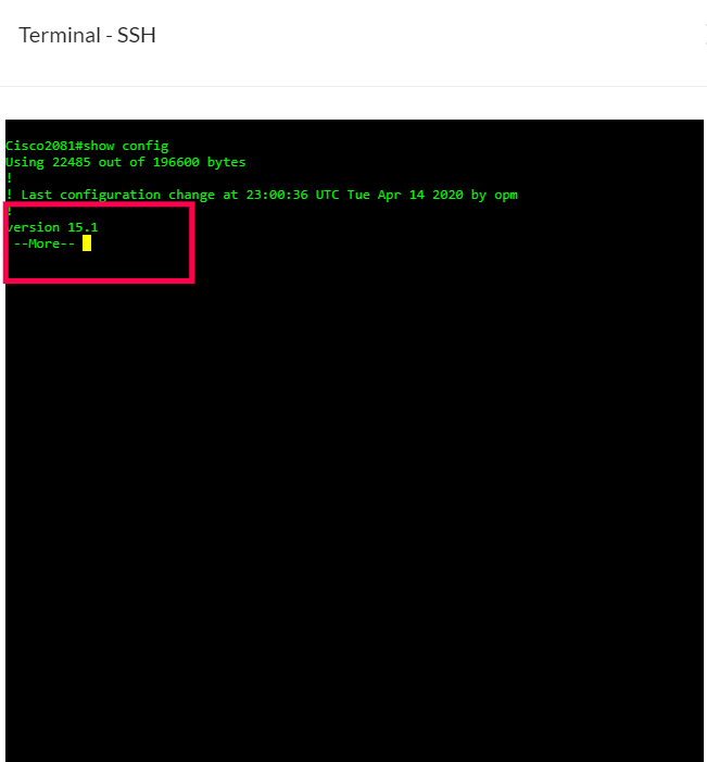 让我们以“show config”命令为例,配置文件的大小可能太大而无法放入单个窗口。在这种情况下,我们会看到类似“--More--”的prompt,之后查看其余的配置命令。手动执行命令时,“--More--” prompt可以通过回车来响应。