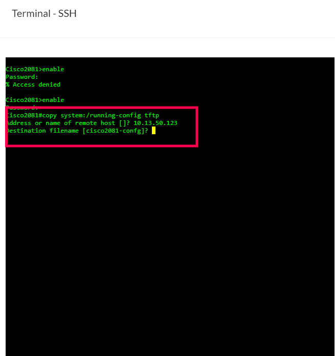 上图显示了终端中的prompt "]?"。当执行命令"copy system:/running-config tftp"时,它会询问远程主机(设备地址),主机地址将被自动获取。