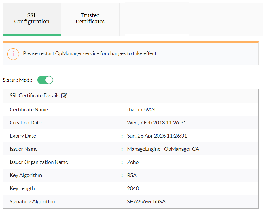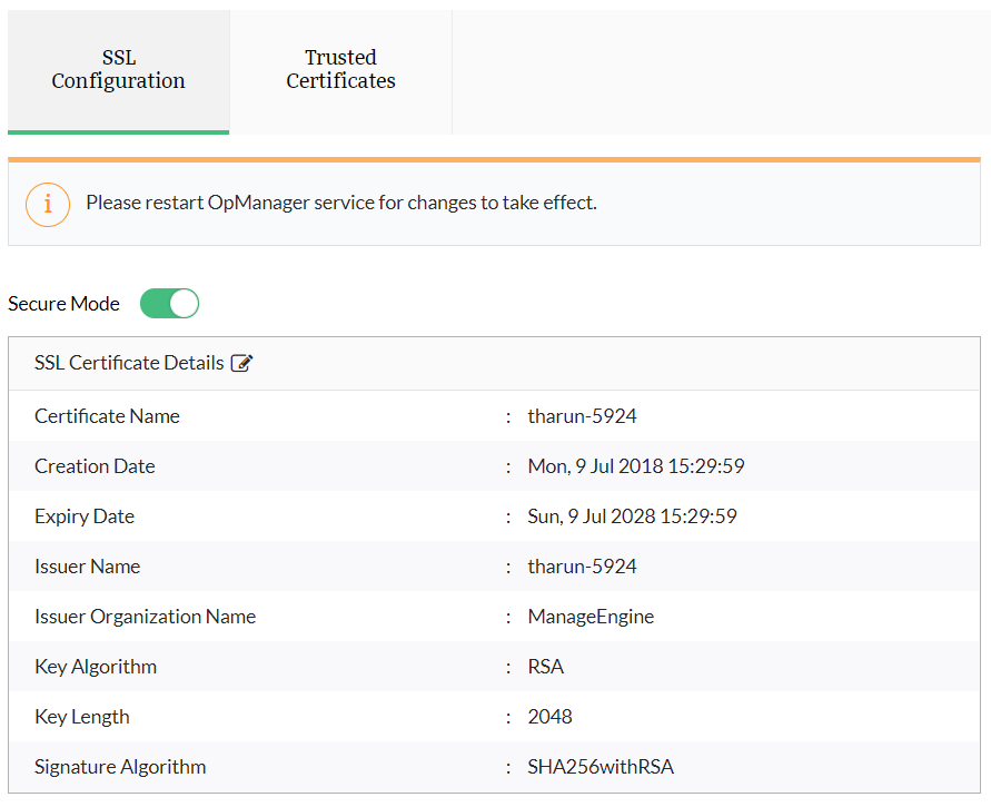 此选项允许您使用自生成和自签名证书在NCM中启用SSL。该证书使用安全,同时拥有相同的安全性。但是浏览器可能会将它们显示为不受信任,因为它没有由有效的CA(证书颁发机构)签名。