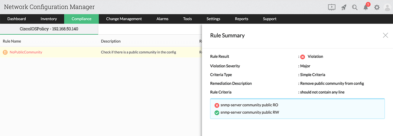 法规遵从性报告还显示每个法规遵从性策略下每个规则的符合性状态的详细视图。该视图包含规则符合性结果、违规严重性、规则条件和必须采取的纠正措施的说明。该规则还显示已检查的配置字符串的符合性状态