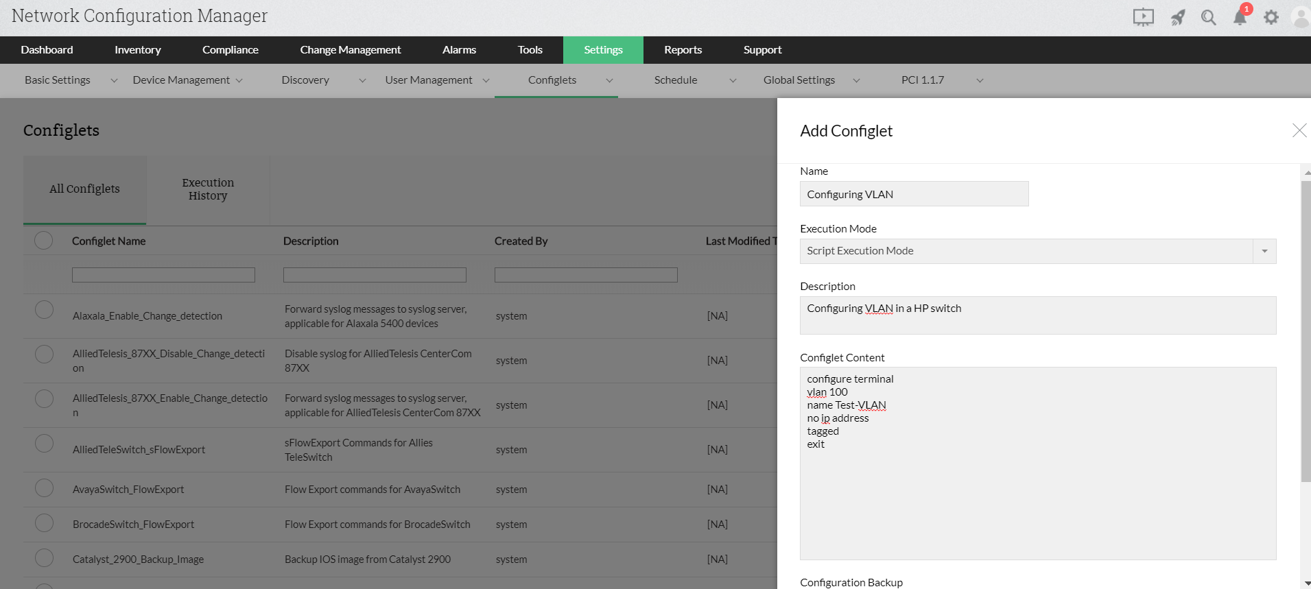使用Network Configuration Manager,您可以在交换机中配置VLAN并开始有效地管理流量、增强安全性以及快速解决网络问题。您可以借助Configlets在Network Configuration Manager中配置VLAN,Configlets是可执行的配置模板,可帮助您自动执行重复和复杂的网络操作。
