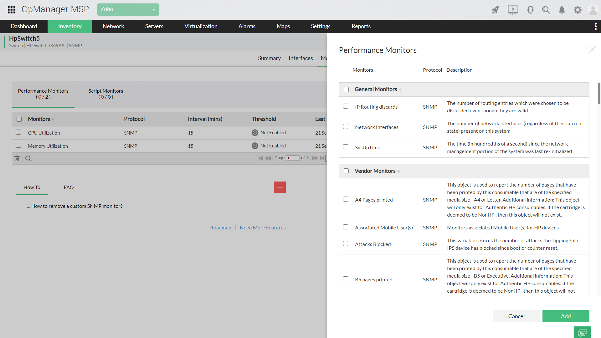您可以将性能监控器与设备关联,设置基准阈值,并监控违规情况。性能监控器可以手动与设备关联,也可以在发现后使用设备模板自动关联。OpManager MSP的设备快照页面显示实时设备性能统计信息。如果默认性能监控器不能满足要求,则可以在从供应商处获得SNMP MIB之后添加自定义SNMP监控器。