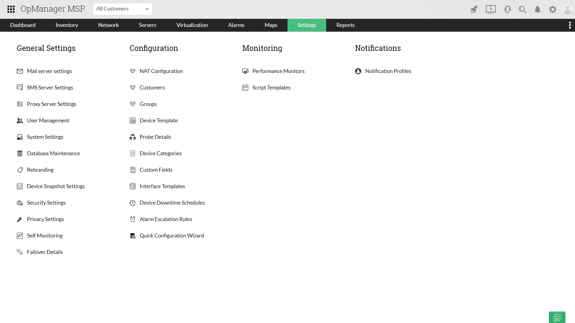 OpManager MSP的多租户体系结构使您可以同时从中央控制台跟踪所有客户端的故障或深入研究每个客户的网络故障。OpManager MSP可检测所有事件并隔离可能影响网络性能的故障。