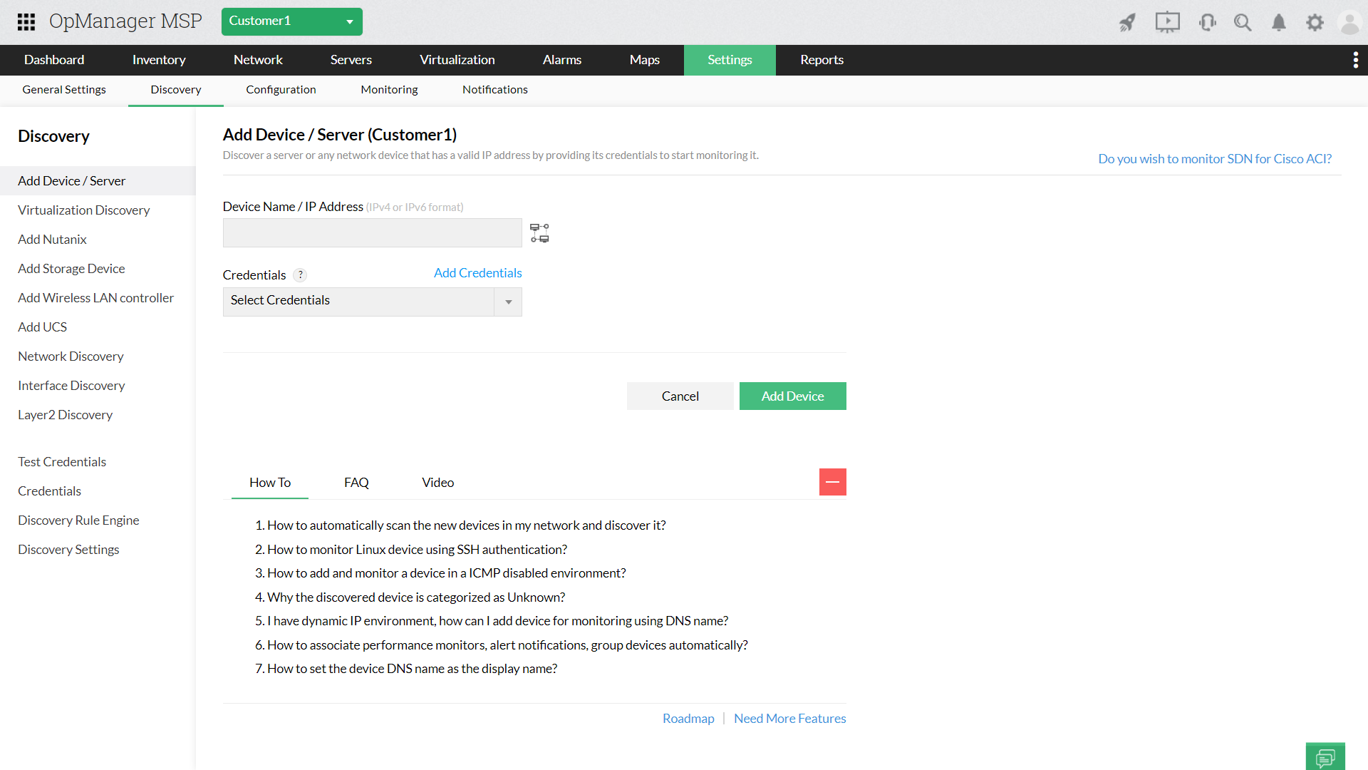 在中央服务器中配置探针和客户详细信息之后,您可以立即开始从客户端网络发现设备。OpManager MSP的多租户架构使您可以从中央控制台的便利中发现设备。使用OpManager MSP,您可以手动发现设备,也可以选择自动发现选项,通过这些选项可以批量发现设备。