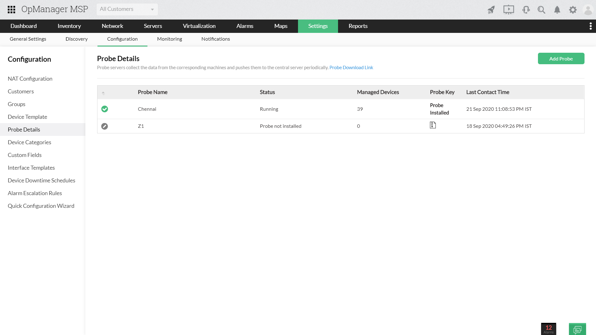 使用OpManager MSP的探针中心架构可实现多租户。为了同时处理多个客户端,在每个客户端站点上部署了单独的探针,并将其连接到位于运营中心或NOC的中央服务器。探针中心架构无需在每个远程站点进行单独的更新和配置,因为在中心进行的更改会反映在所有探针上。OpManager MSP还将许可证从中央服务器推送到所有探针。