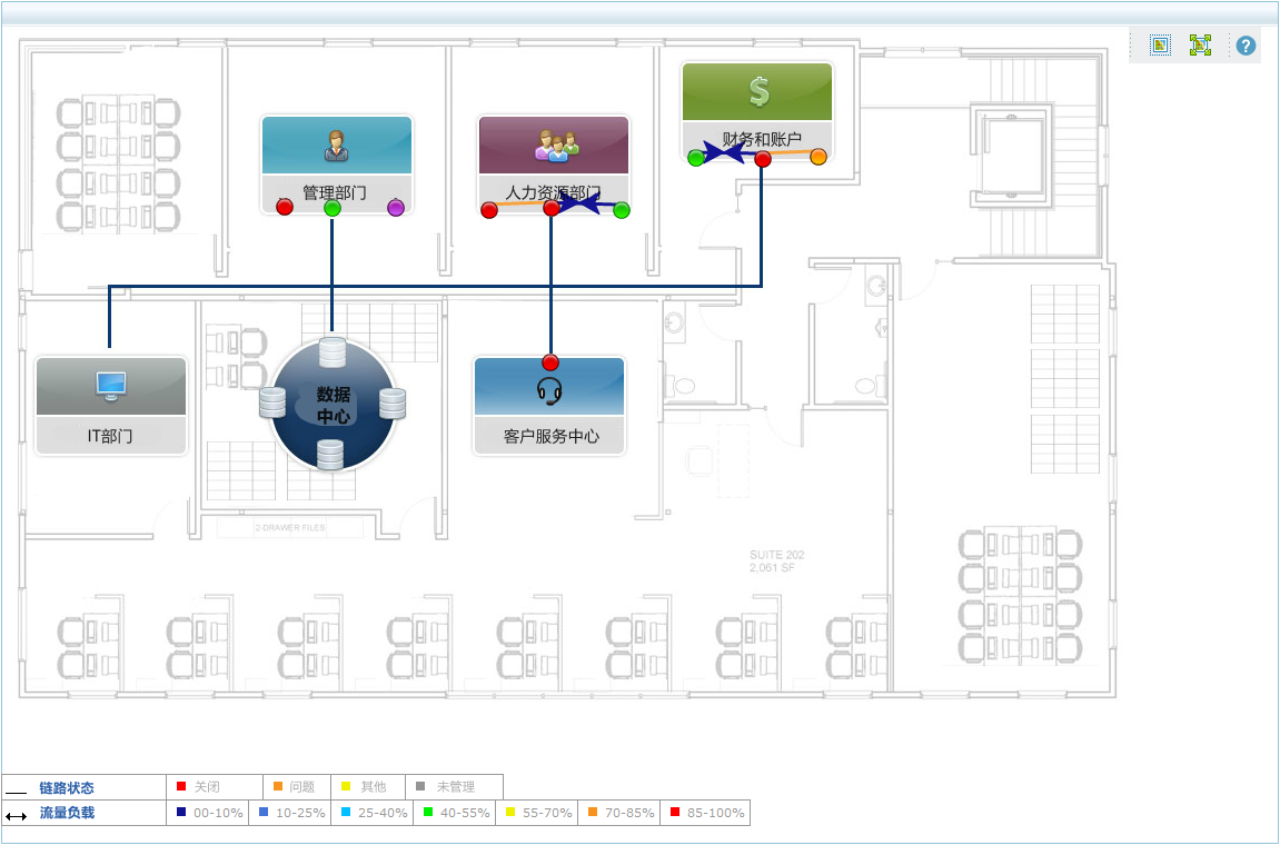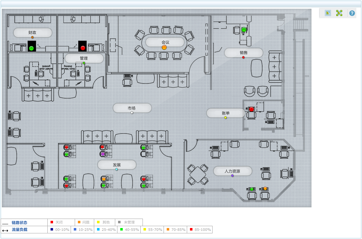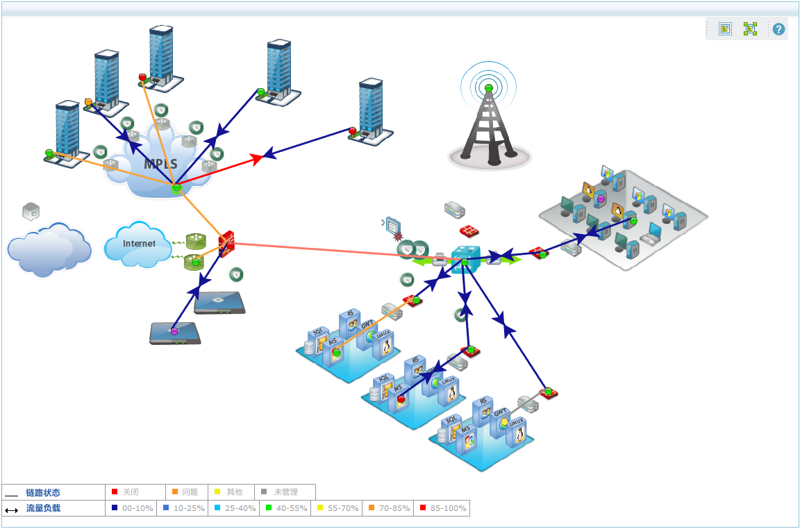 使用制图工具,您可以很方便的创建自定义的网络地图。 按照需要选择您的背景图,将相关设备放置到图中,在它们之间绘制链接。以下为几个示例