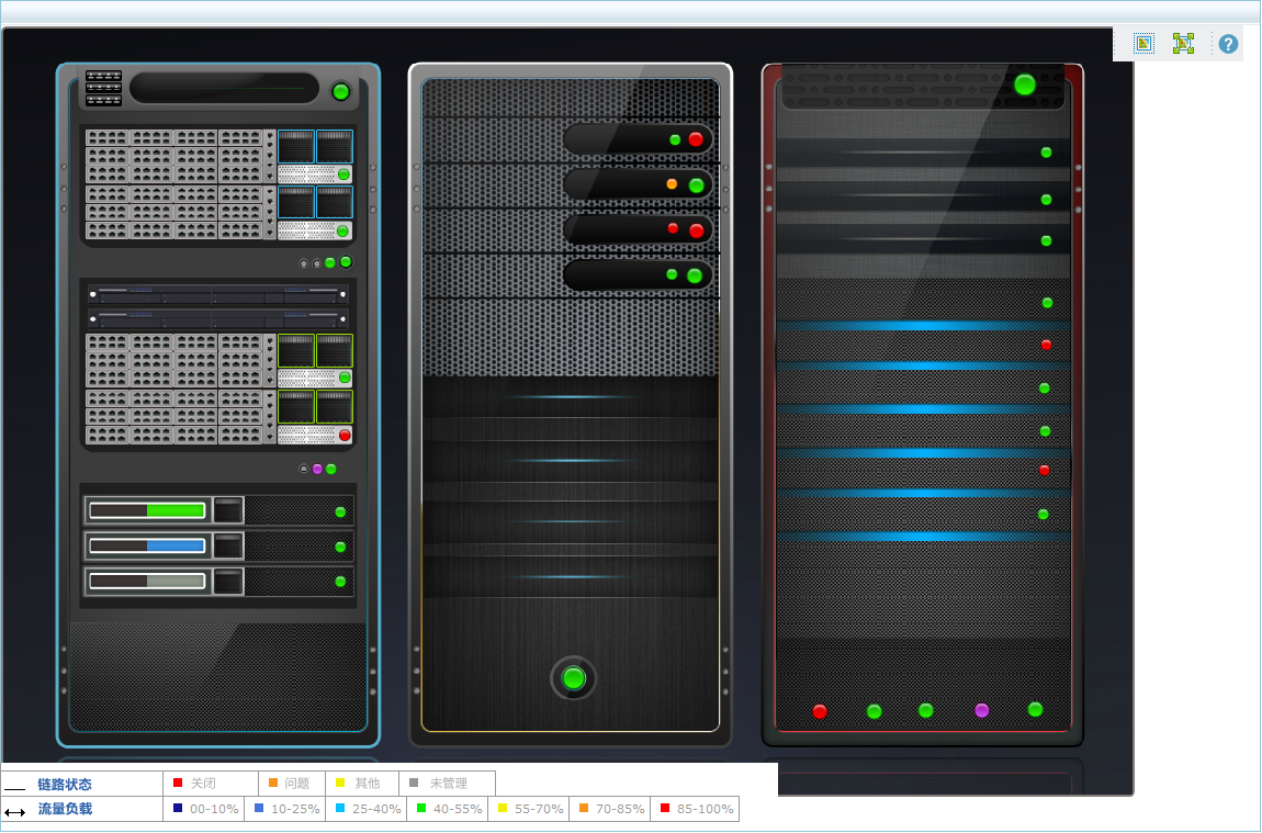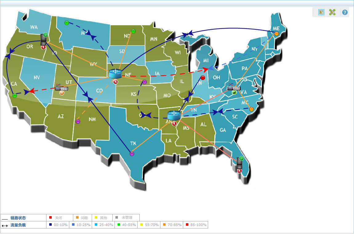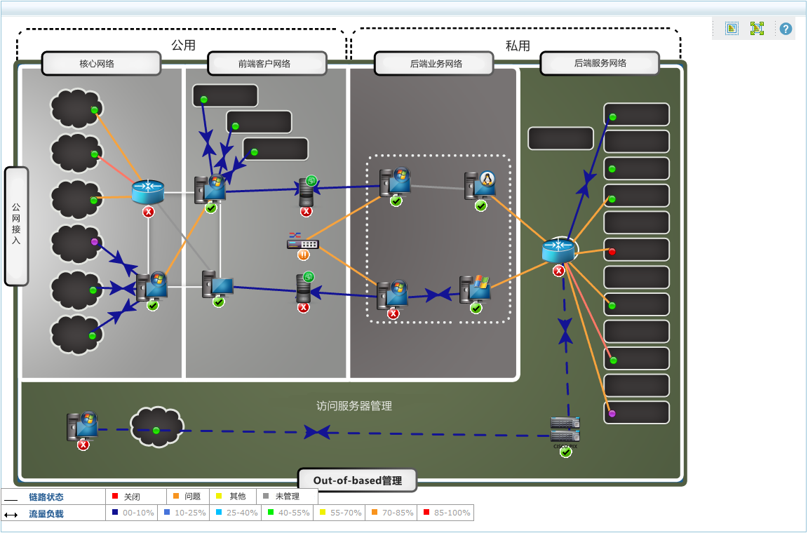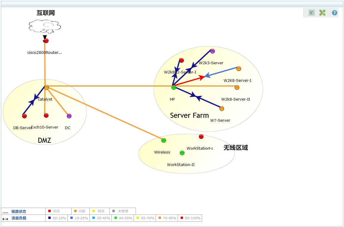 使用制图工具,您可以很方便的创建自定义的网络地图。 按照需要选择您的背景图,将相关设备放置到图中,在它们之间绘制链接。以下为几个示例