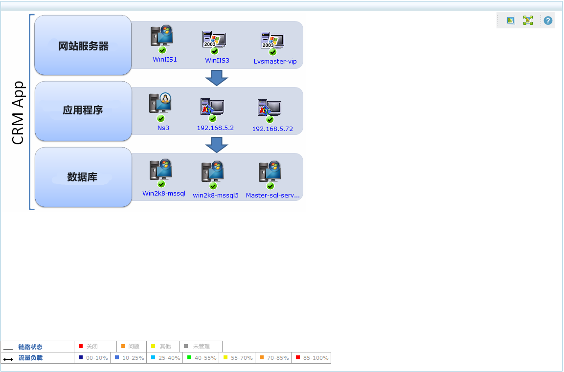 除上述地图之外,您还可以基于业务服务(比如CRM、订单处理系统等)来对设备分组,从而实时了解业务系统的健康状况,当发生故障时,准确定位问题的根源。