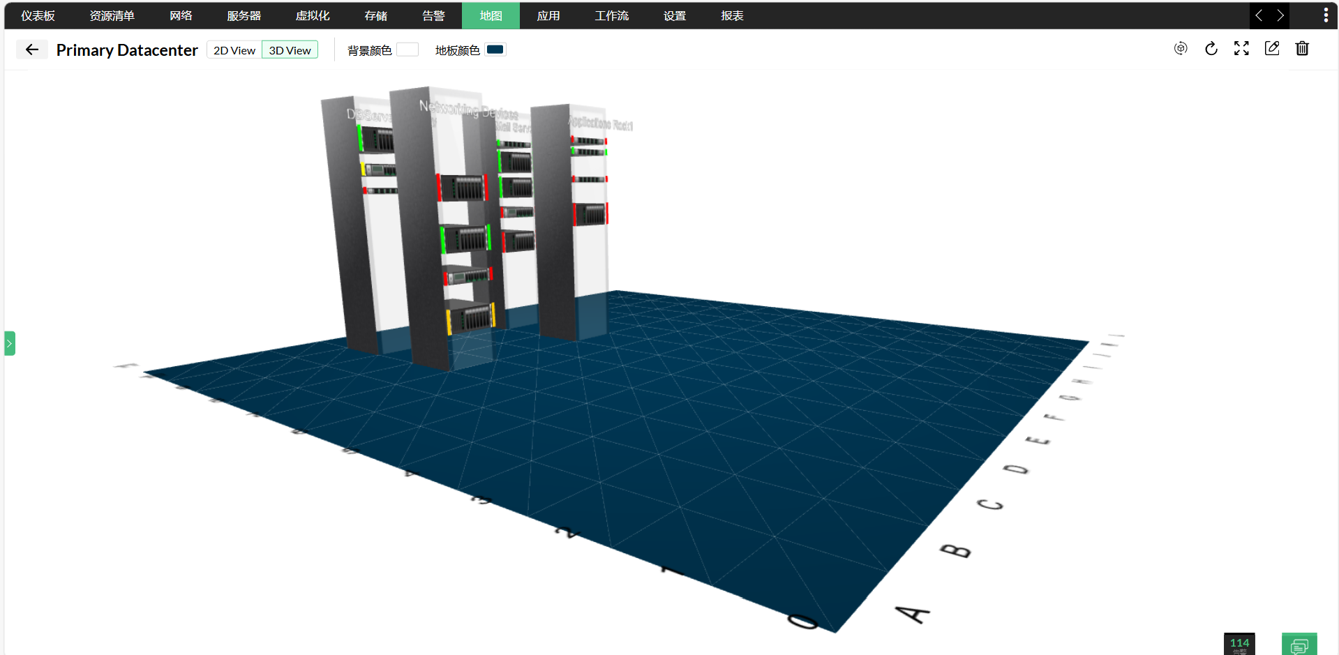 在OpManager中,您可以创建数据中心的3D视图,以方便地了解网络基础设施。您可以先创建机架视图,以创建服务器在各个机架中的排列的虚拟表示,然后在3D地板视图中将这些机架放在地板上。机架上每台服务器的状态都用OpManager的默认颜色代码显示在它旁边,这样可以轻松查看服务器和机架的状态。该特性使您能够获得数据中心状态的可视化概念,而不像其他数据中心监控软件那样仅仅显示数字和统计数据。