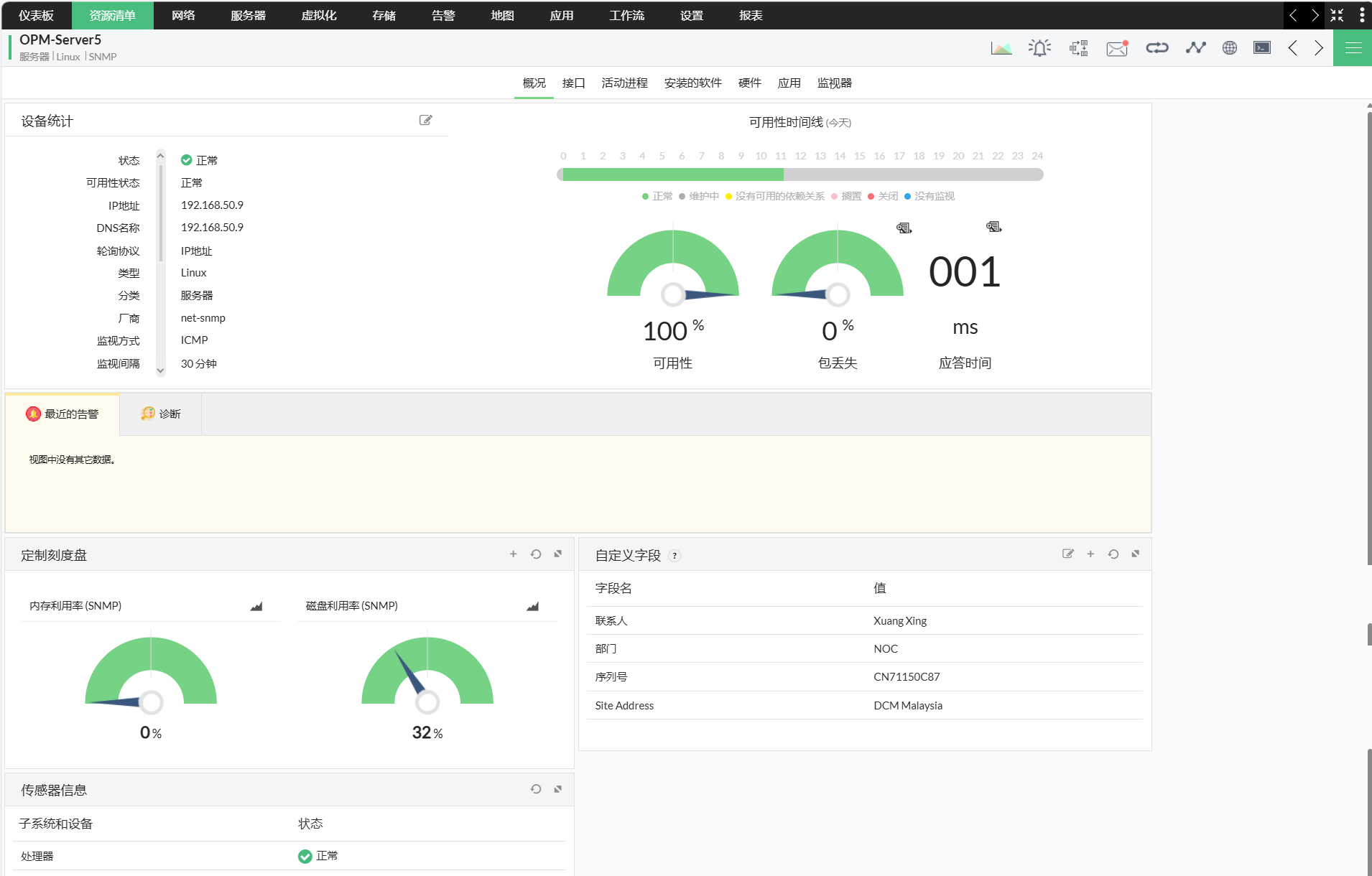 使用OpManager,您还可以从web客户机本身内部监控设备的硬件指标。“设备快照”页中的“硬件”选项卡列出来自该设备的所有硬件指标及其状态。与硬件相关的警报也显示在同一页,使您很容易知道关于您的设备硬件的一切在一瞥。