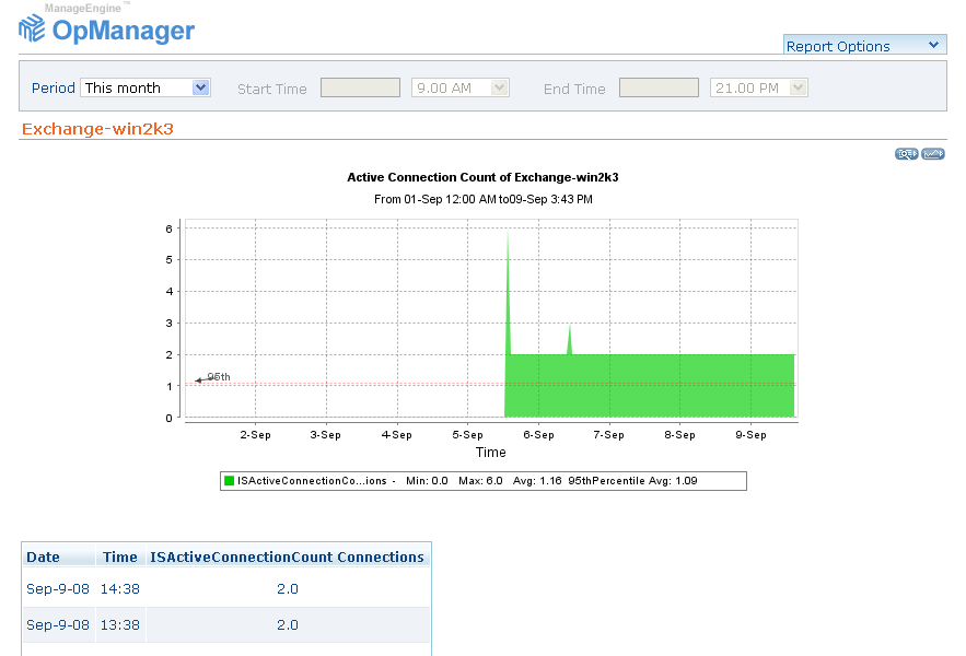 连接/活动连接的队列的增长确实是发生故障的信号。队列增长可能意味着Exchange Server正在遭受垃圾邮件的攻击。如果Exchange服务器发生误操作或者关闭连接失败,则连接数也会增长。队列和/或连接数太大会发生潜在阻塞,以致危及 Exchange 的性能。因此,对队列和连接的监控有助于在尽早识别这样的瓶颈。OpManager 的 Exchange 监控器通过设置阈值可以及时通知用户即将发生的故障。