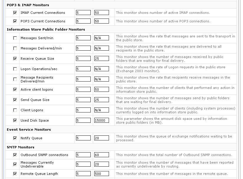 Exchange监控器默认支持监控60多个重要参数。此外,多个监控器还根据Microsoft推荐的最佳实践预置阈值。用户可以使用这些值或根据实际情况设置。
