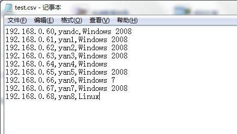 - 创建一个如下图所示的csv文件。指定IP地址/主机名、显示名称和设备类型。