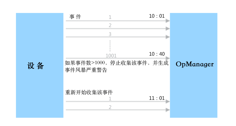 OpManager可以监视事件的数量,根据预定义的条件来处理事件风暴。例如:一个事件的数量超过了预定义的数量,OpManager将停止处理后续所接收到的事件,并生成一个严重的告警,表明从哪个设备收到了哪个事件风暴。然后在下一小时之后,再恢复对该设备、该ID事件的处理。过程如下图所示: