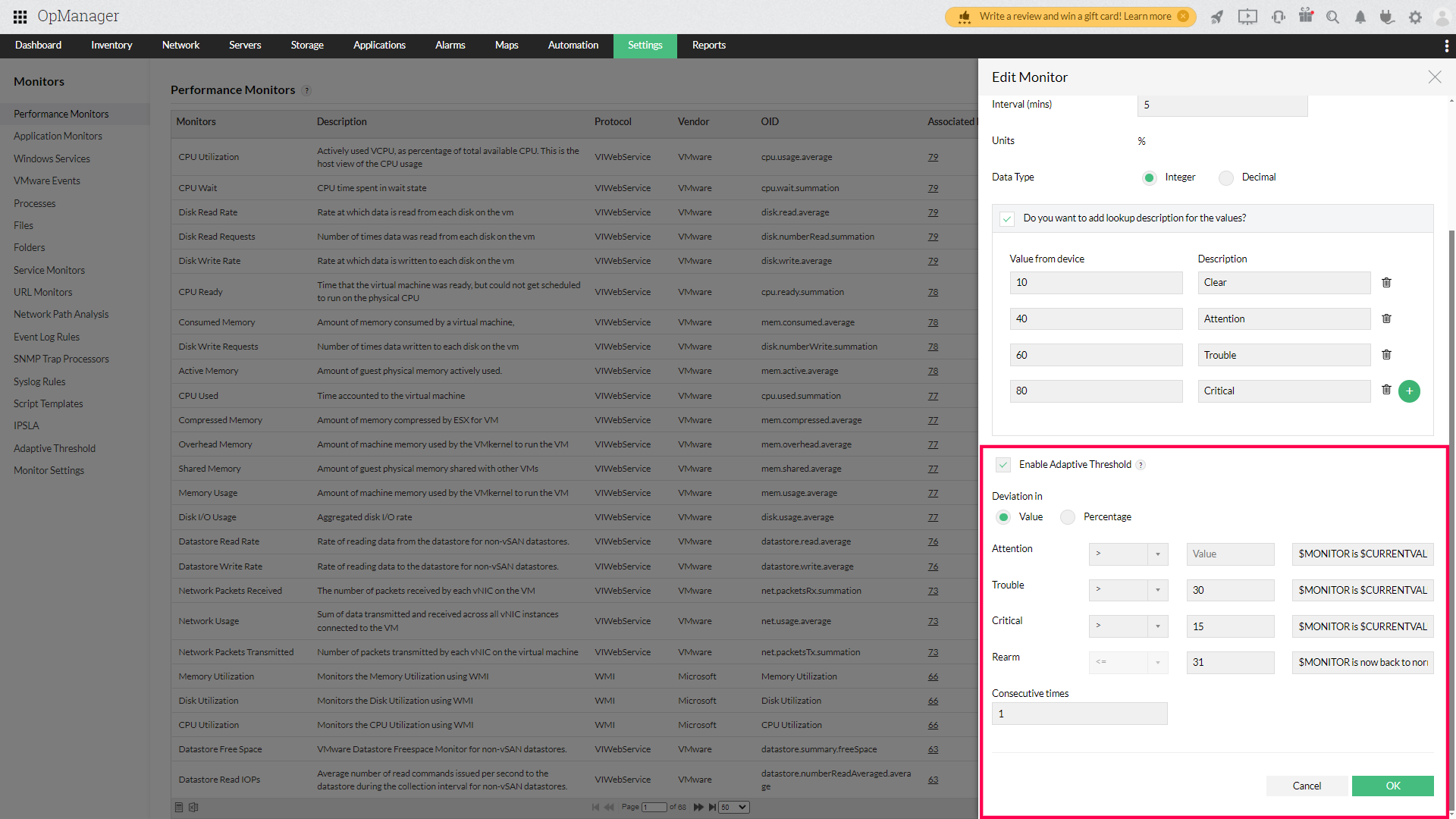- 您还可以为OpManager中使用的特定监视器启用自适应阈值。只需转到“设置>监视”下的“性能监视器”页面,找到要为其启用的监视器,然后单击“编辑”。