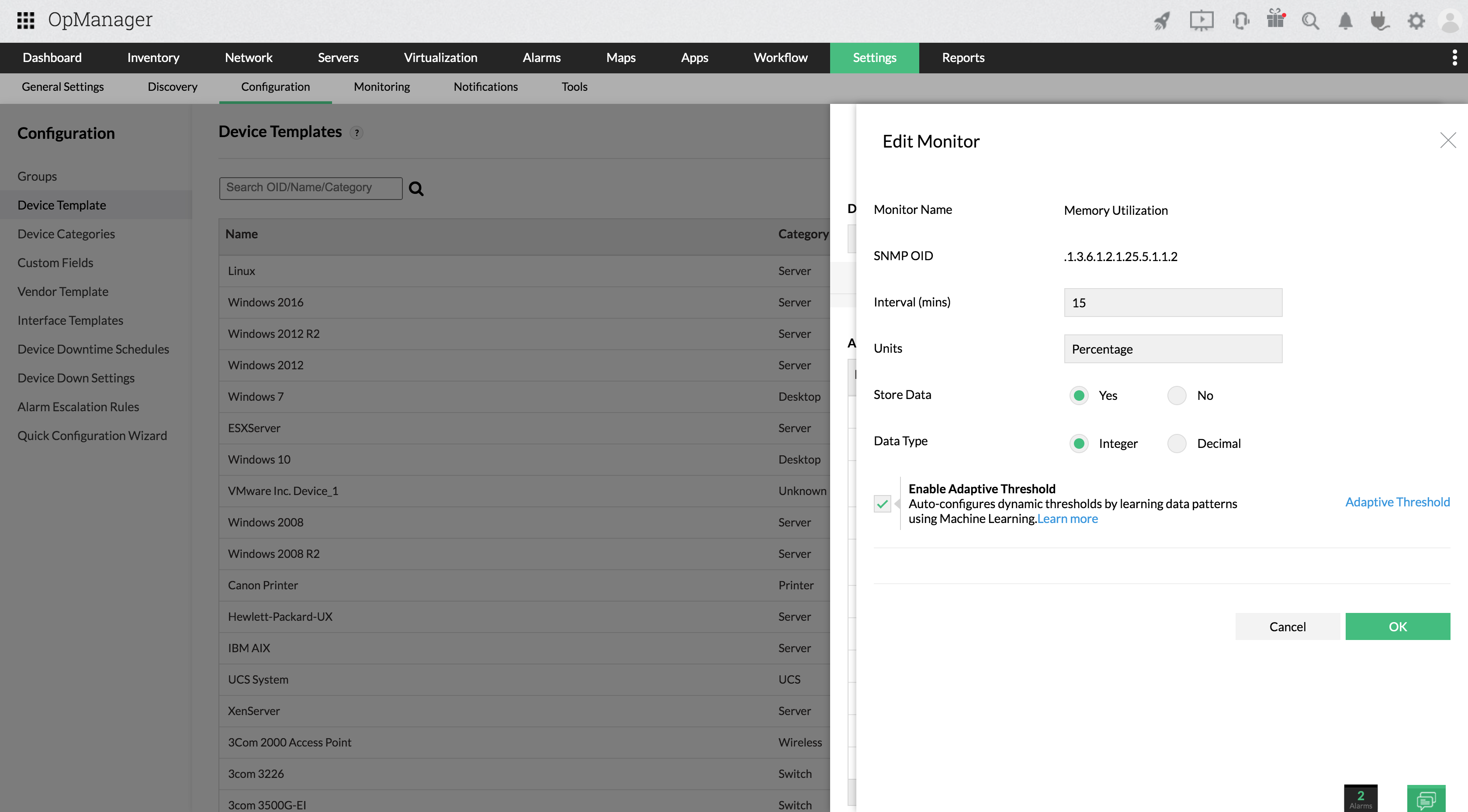 - 转到设置->配置->设备模板,选择合适的模板,然后单击任何支持的监视器以启用自适应阈值。完成后,单击“确定”以保存更改。