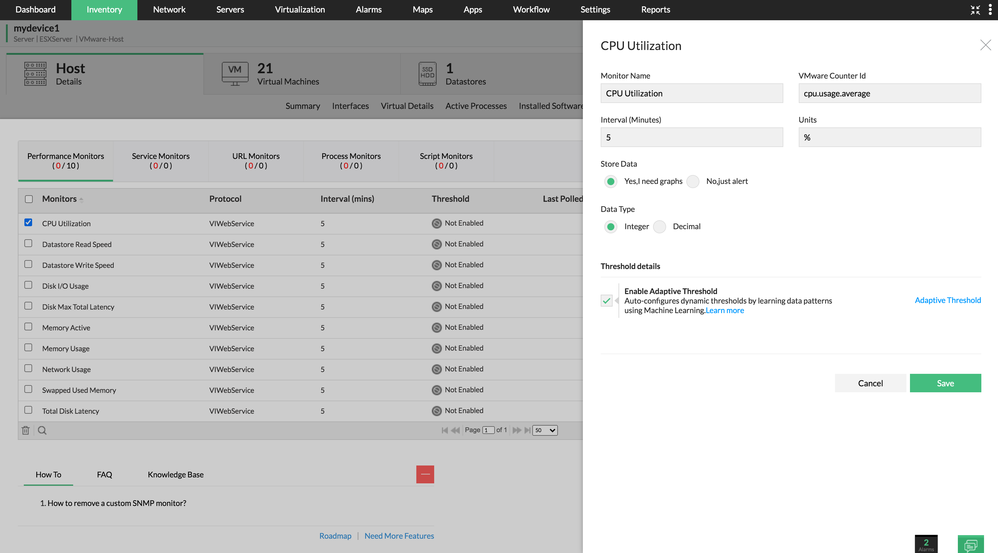 - 单击“保存”将更改应用于监视器。一旦有足够的数据可供算法使用,OpManager将开始预测阈值(至少3天)。